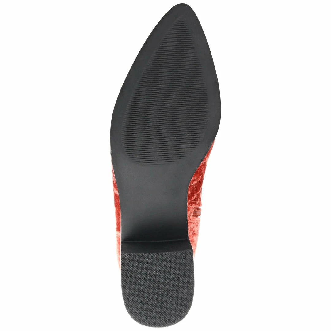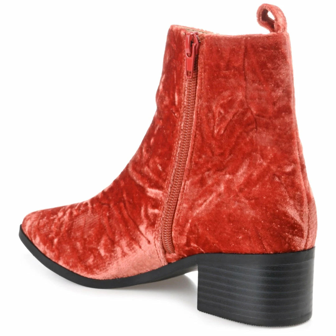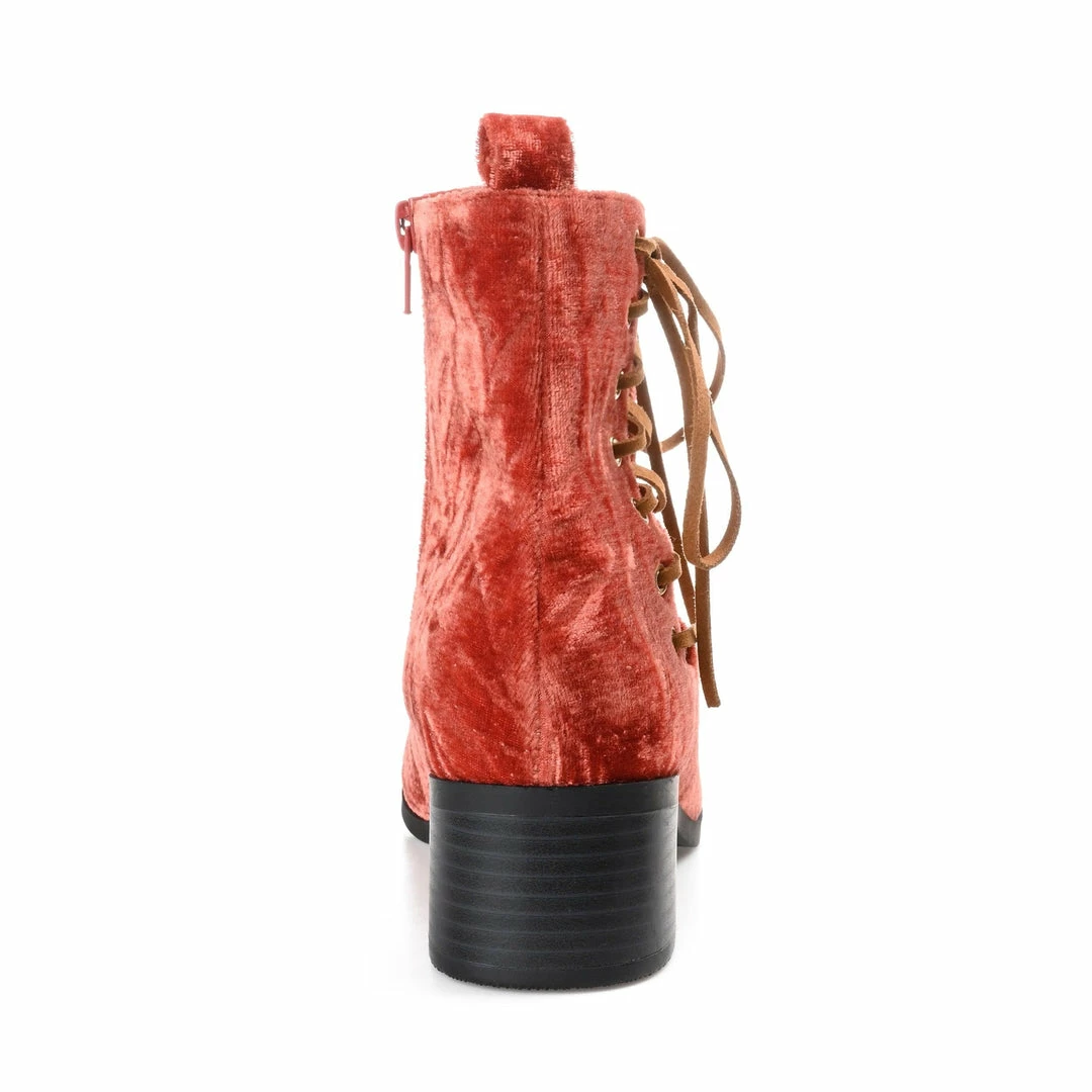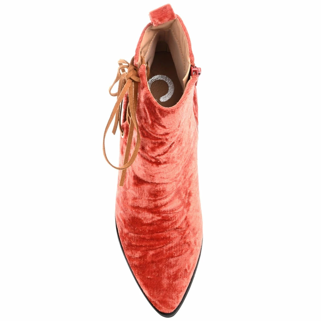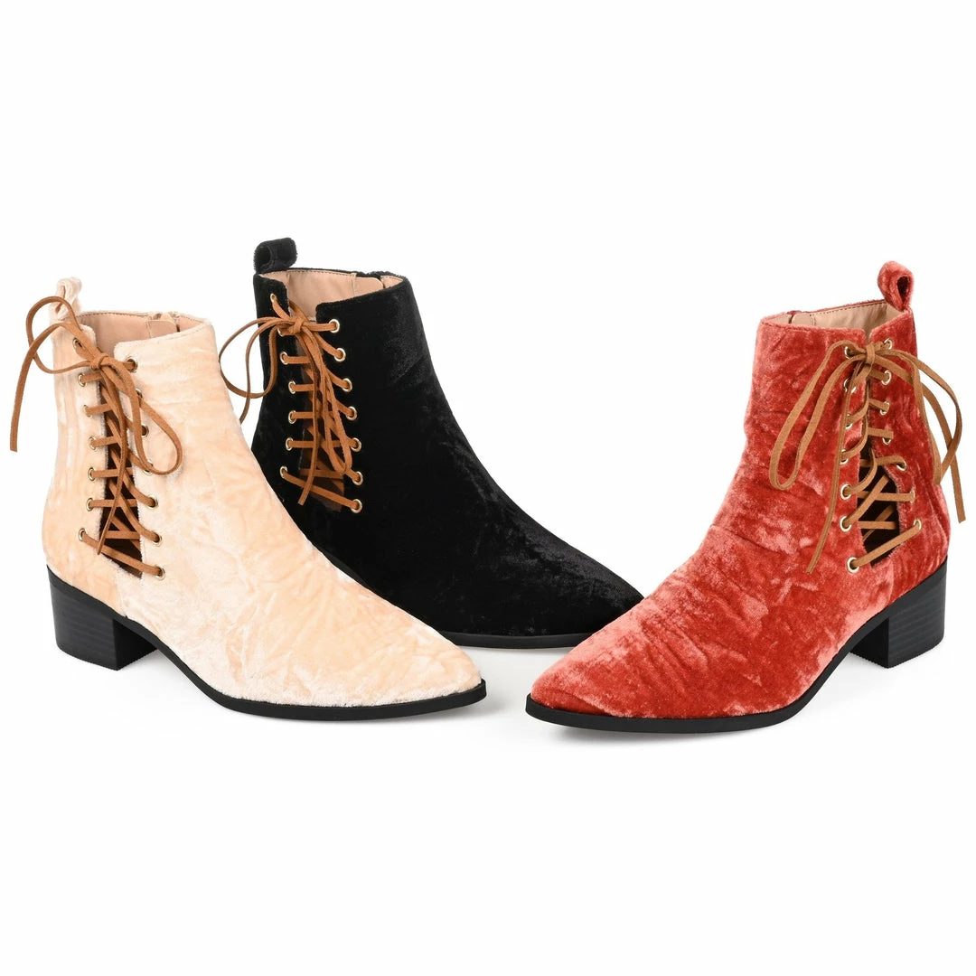 With an open lace-up detail at the ankle and crushed velvet fabric, these pointed-toe booties are the perfect bold addition to your favorite fall looks.