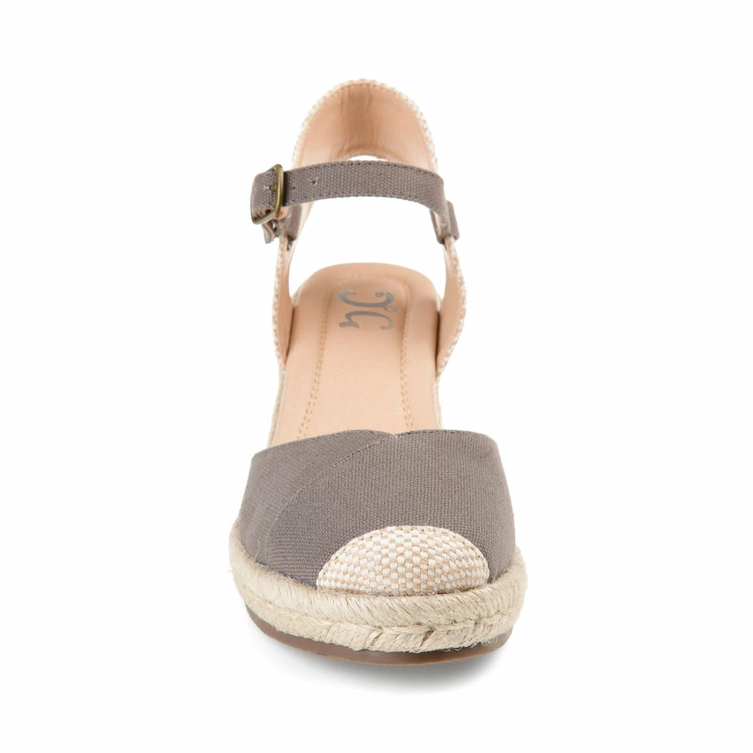 This warm-weather look features light canvas uppers elevated by a wedge heel covered with braided espadrille. A slender buckled ankle strap, open back design, and cap toe complete this charming heel.