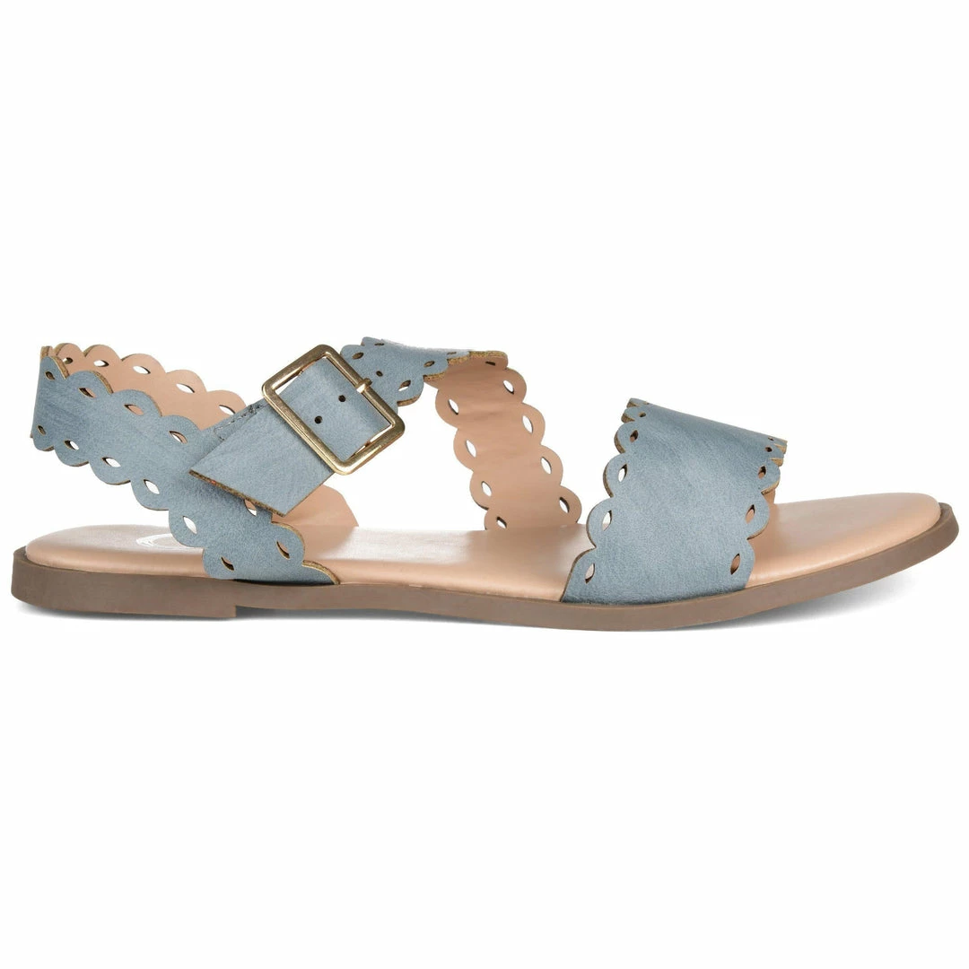 A toe strap sandal detailed with darling scalloped trim and a crossover accent fastened by a gold-tone buckle.