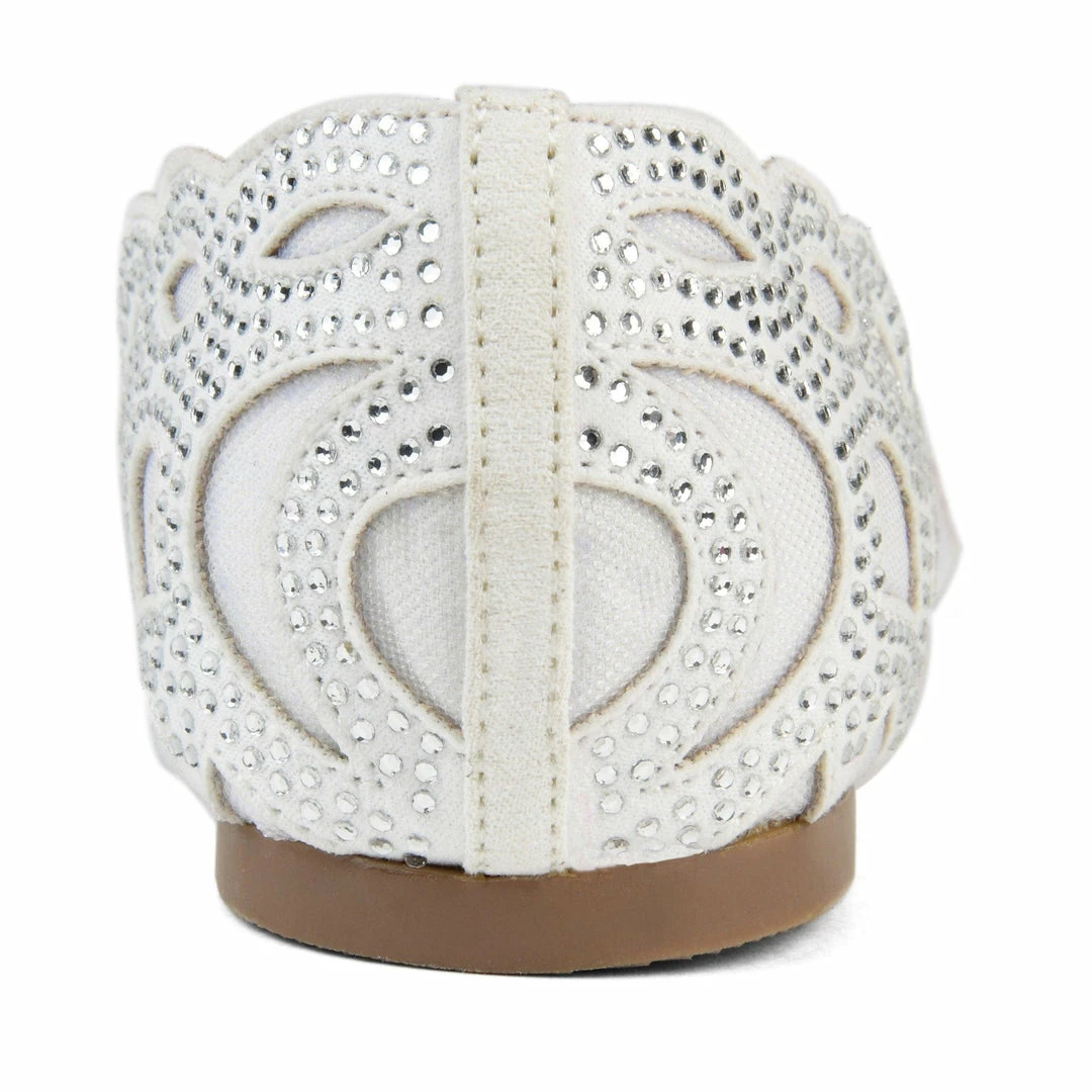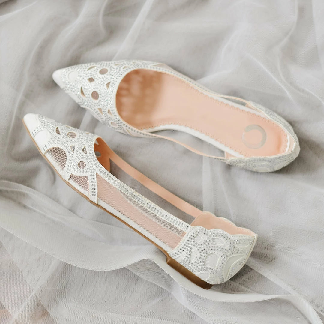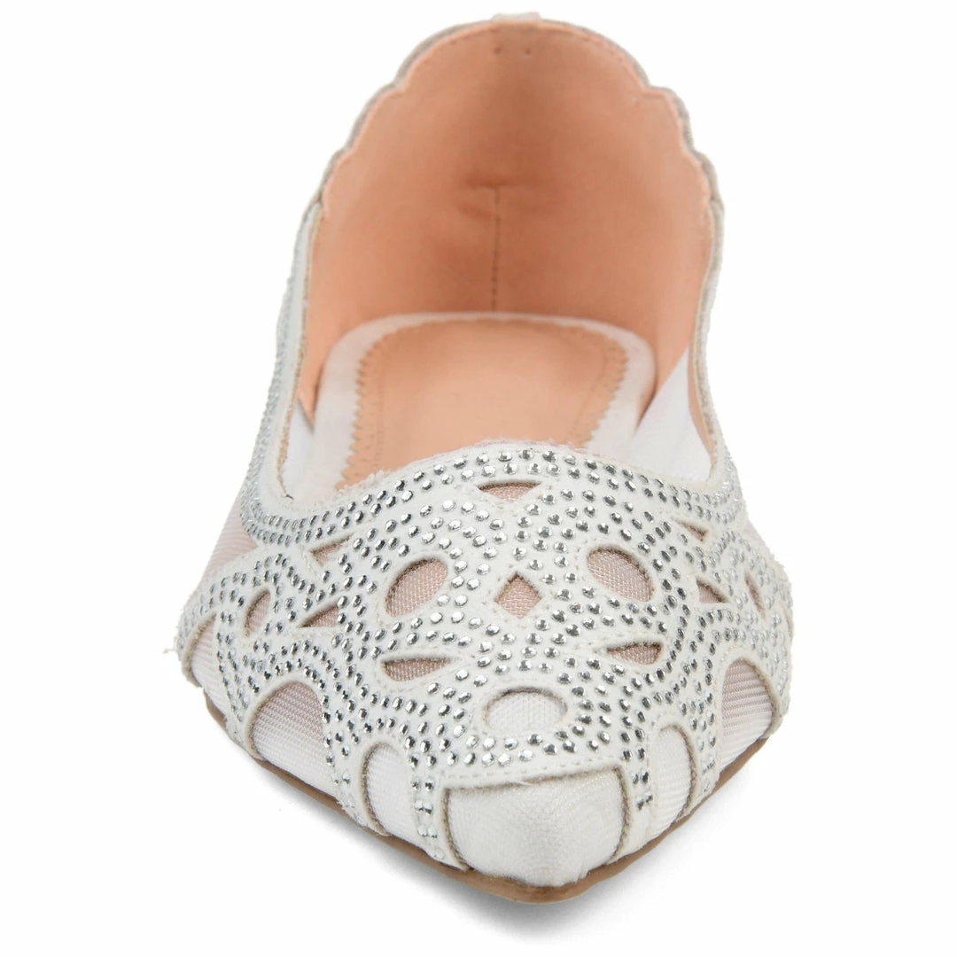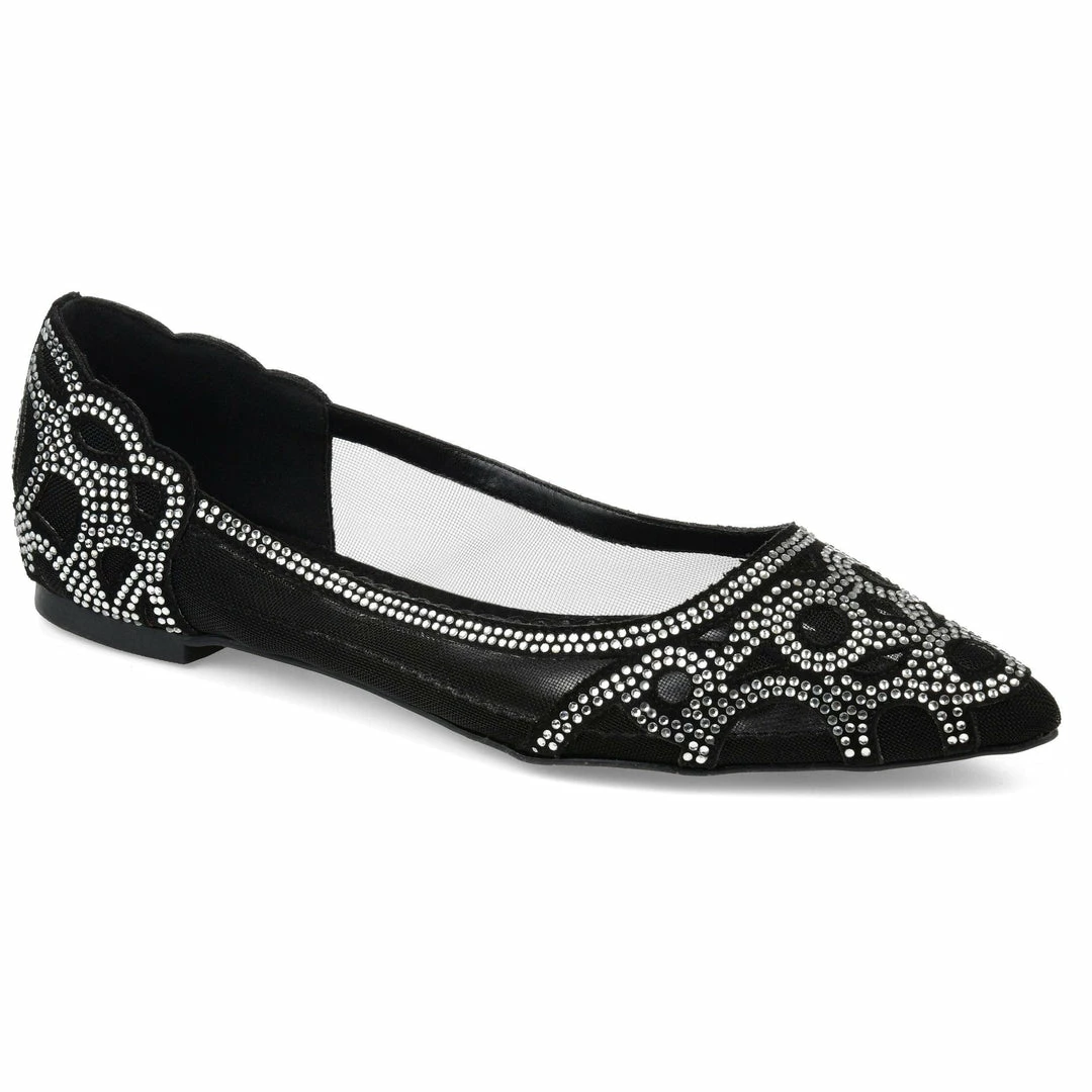 Rhinestone accents and a scalloped heel embellish this enchanting mesh and man-made pointed-toe flat.