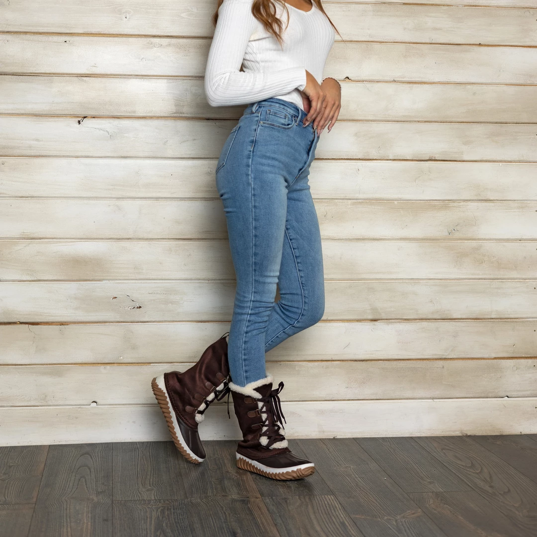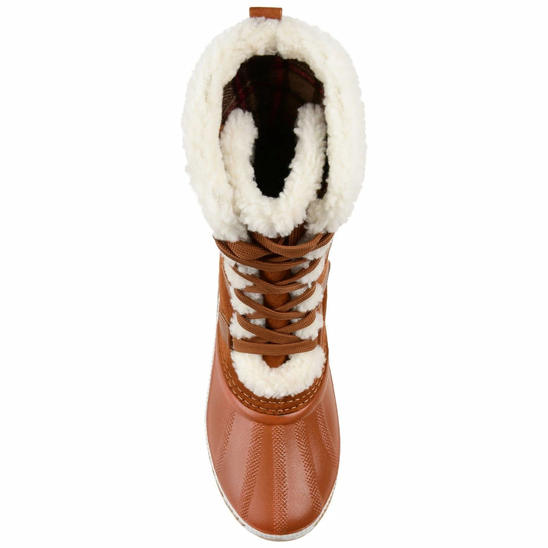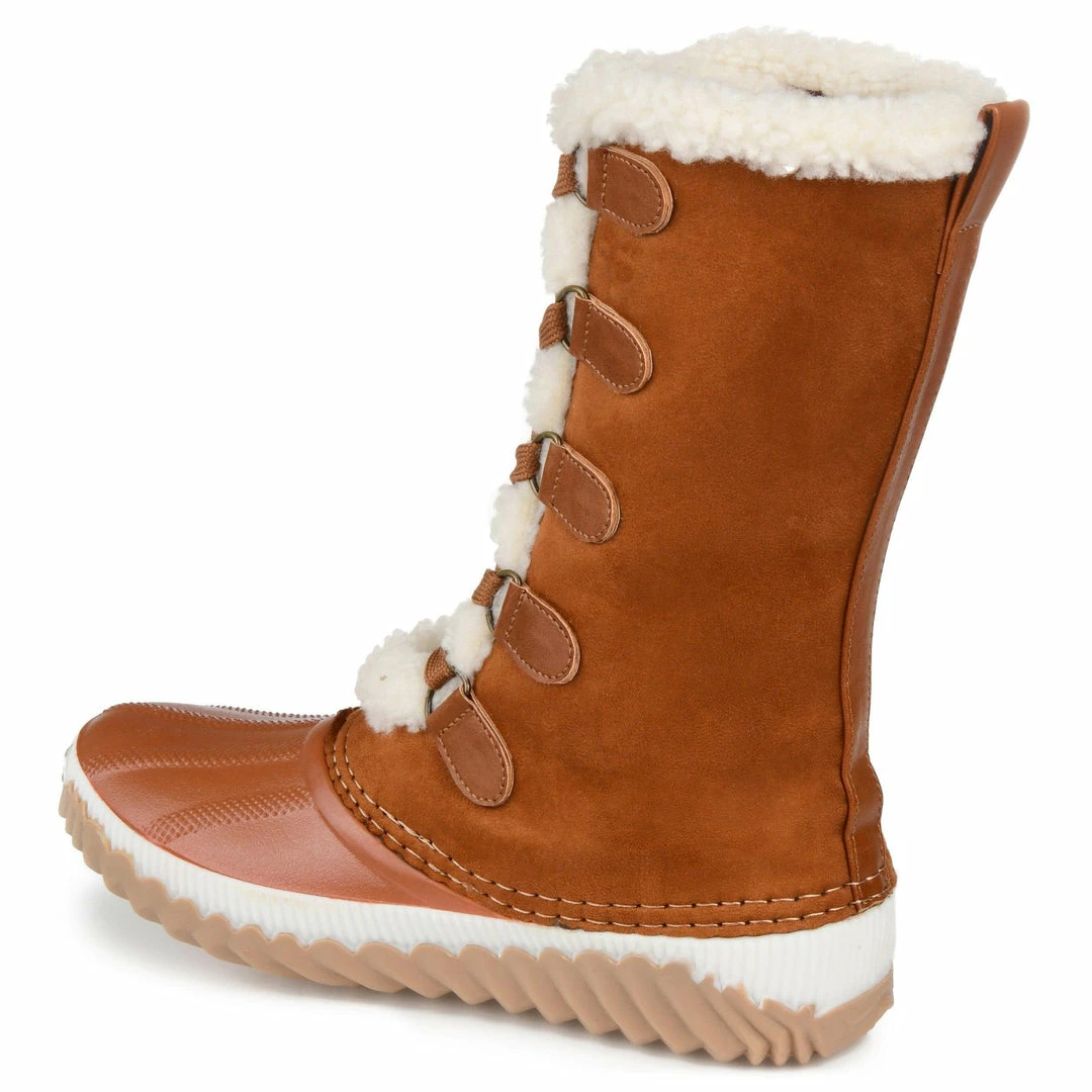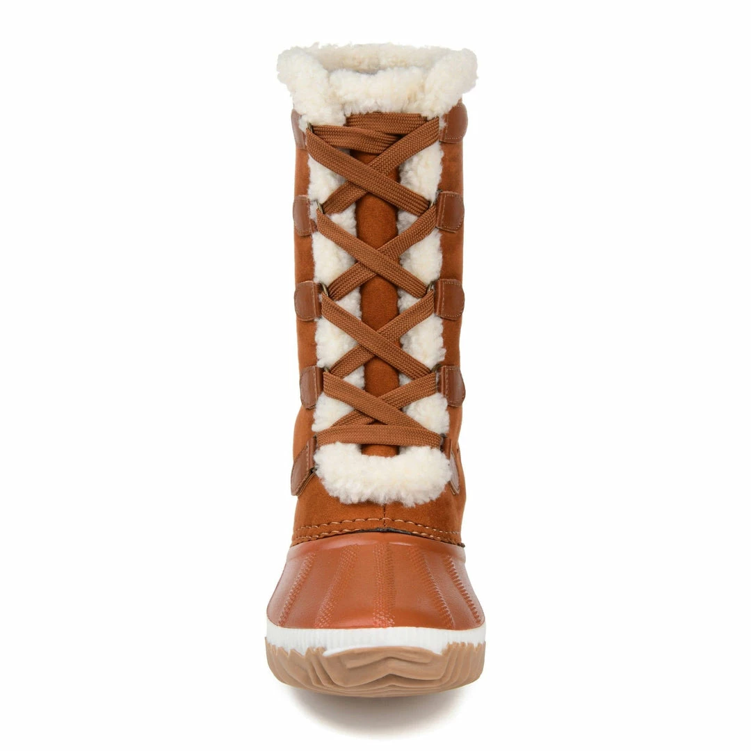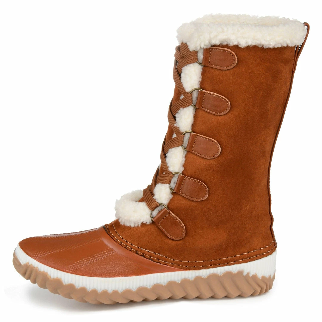 Cozy fleece lining and a waterproof duck foot detail make these vegan leather winter boots ideal for wind, chill, and rain. A textured rubber sole and a 4 mm Comfort Foamâ„¢ footbed finish this snug lace-up design and keep you on your feet with ease.