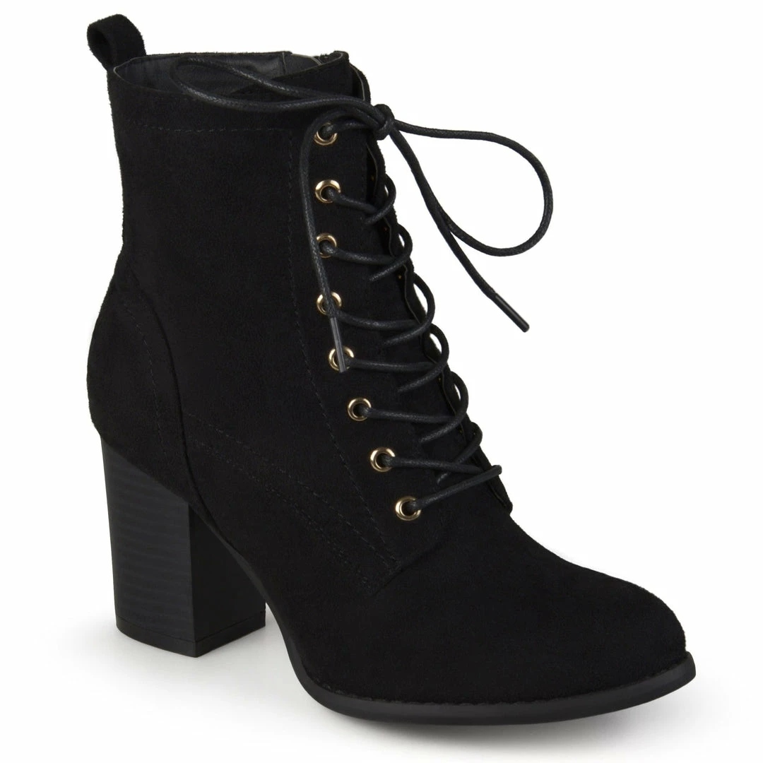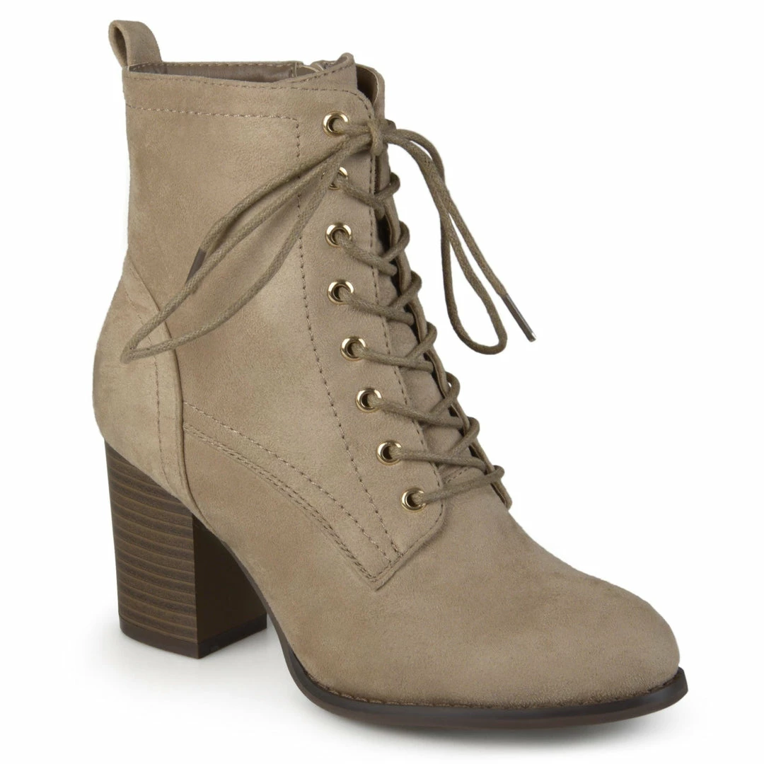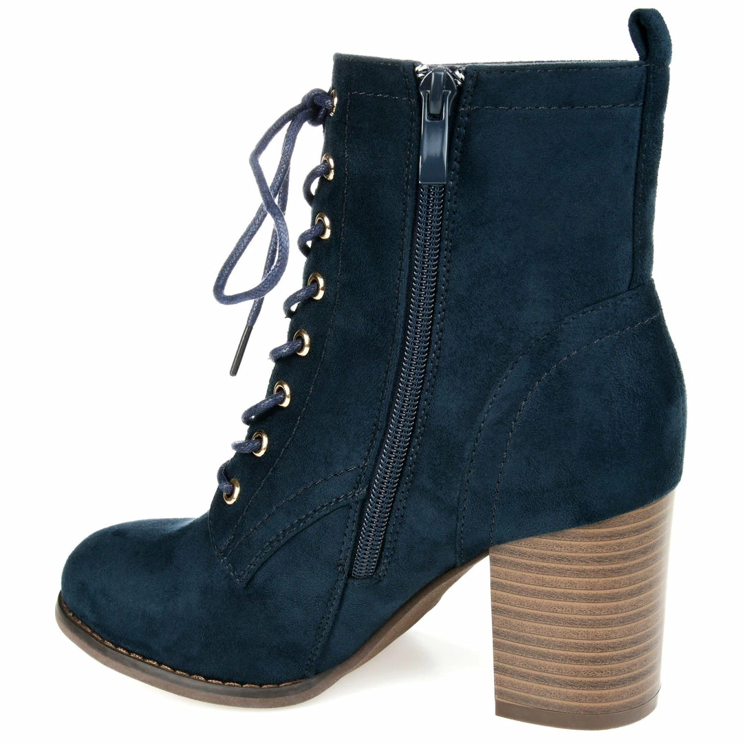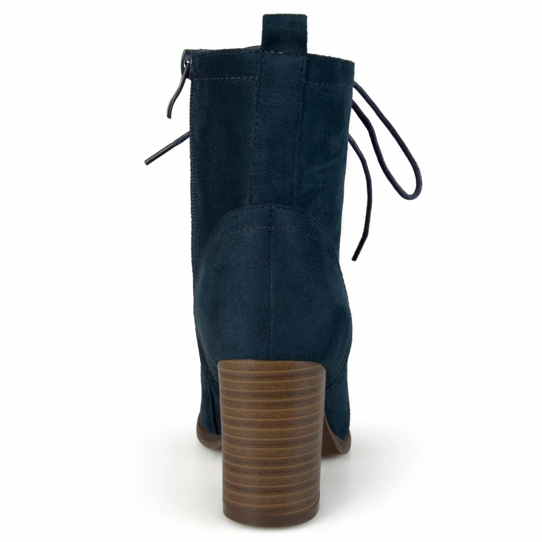 A chunky stacked block heel and a round-toe add a feminine touch to this lace-up military-inspired vegan suede bootie.