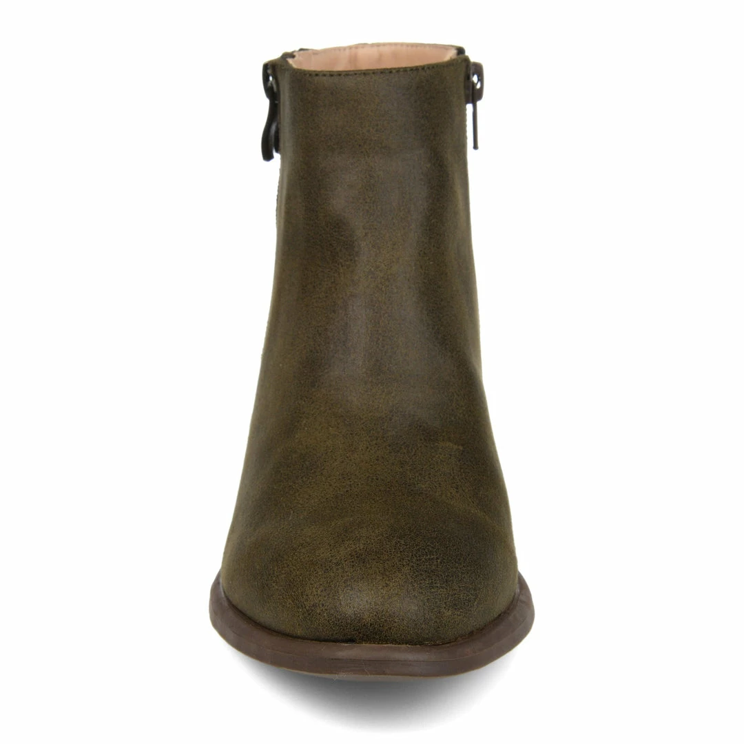 Twin exposed zippers align at the side of this vegan suede bootie elevated by a stout block heel.