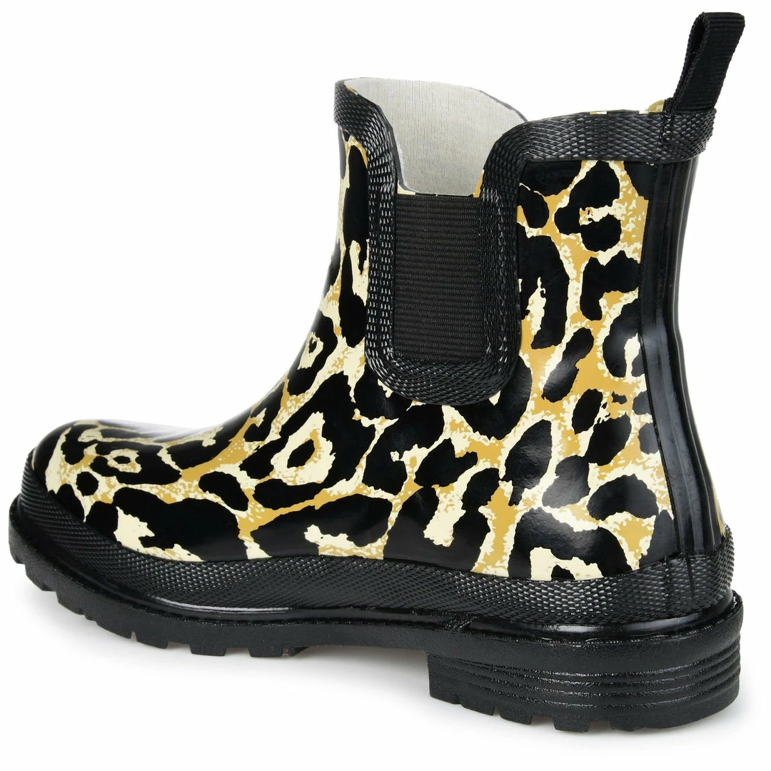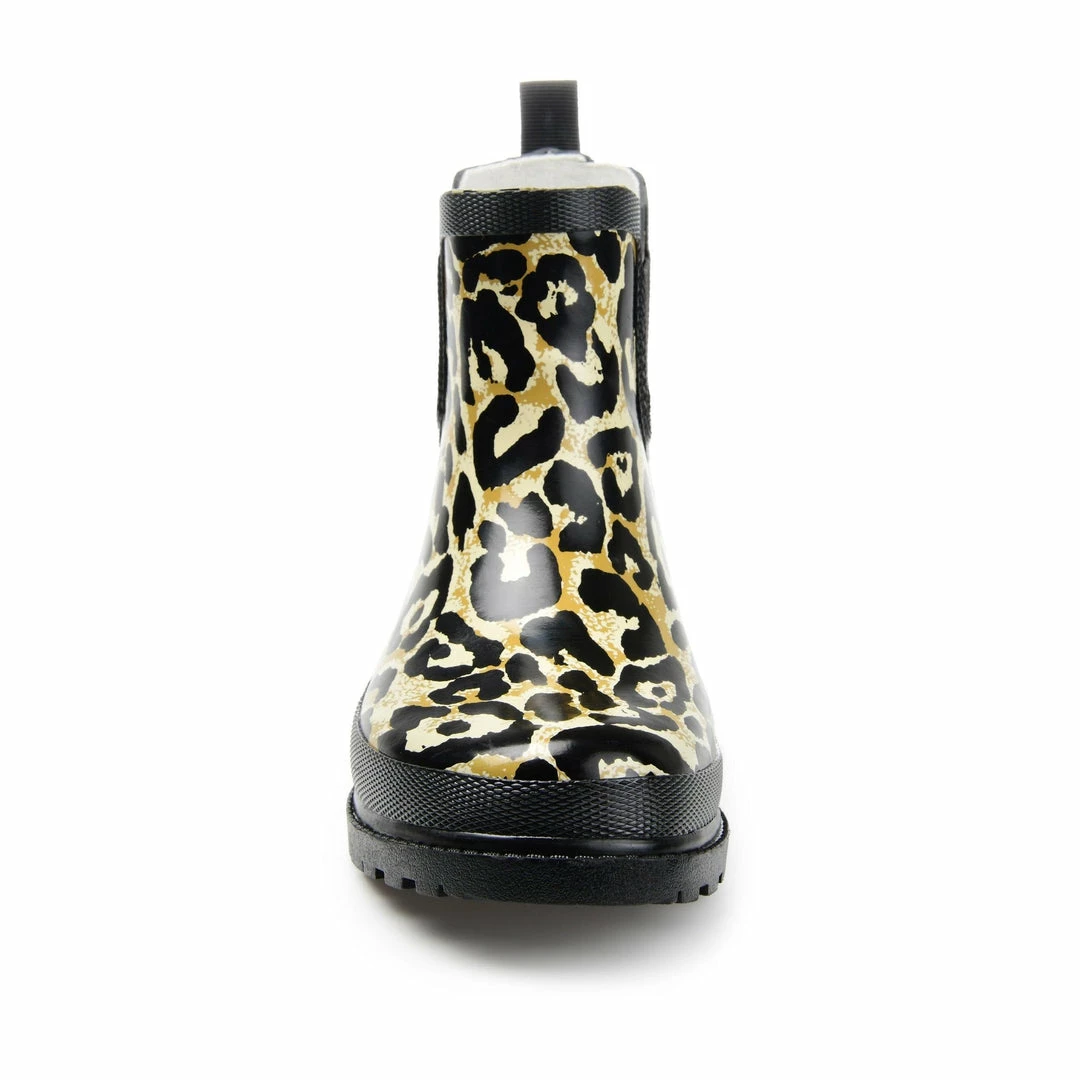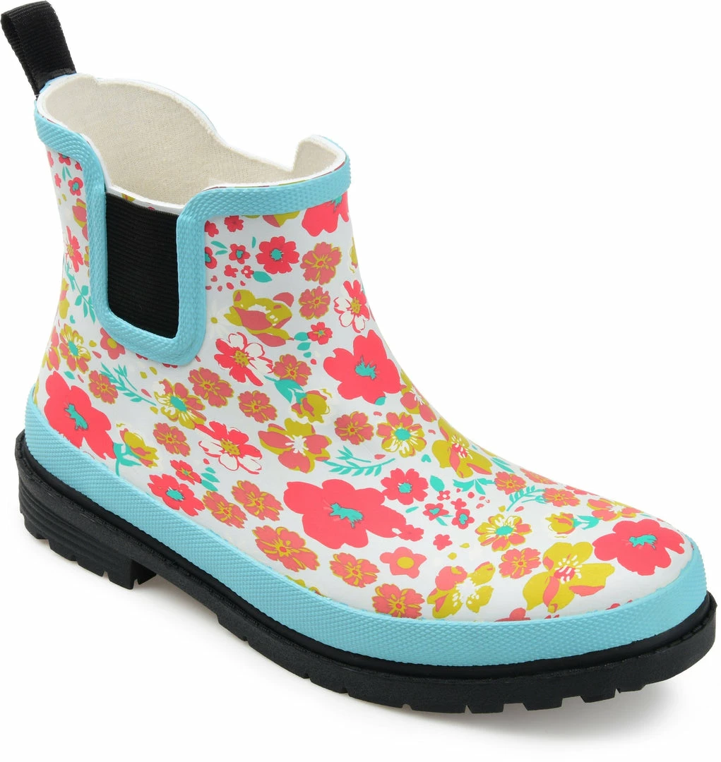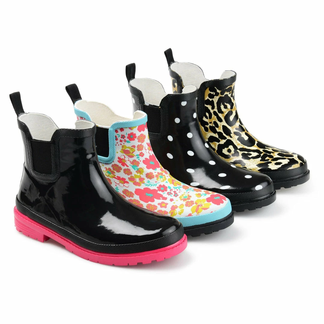 A lively print and a textured sole detail this waterproof rain boot. Stretch goring on either side and an ankle-high cut finishes the look for a flexible, comfortable fit.