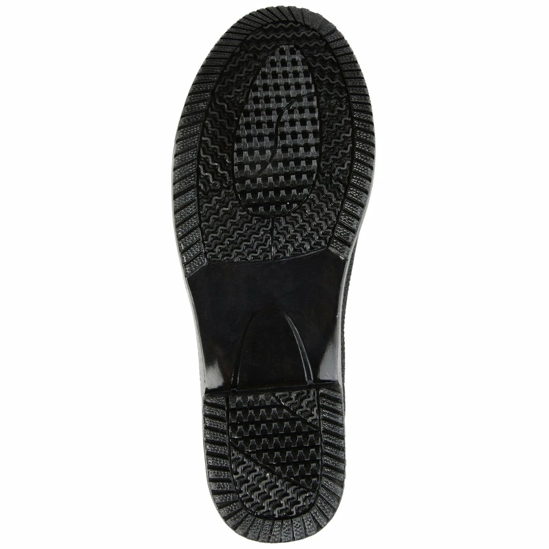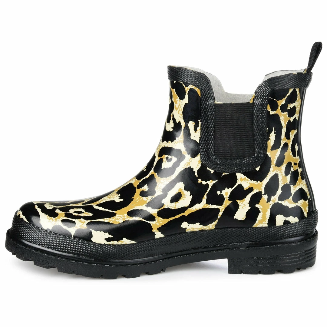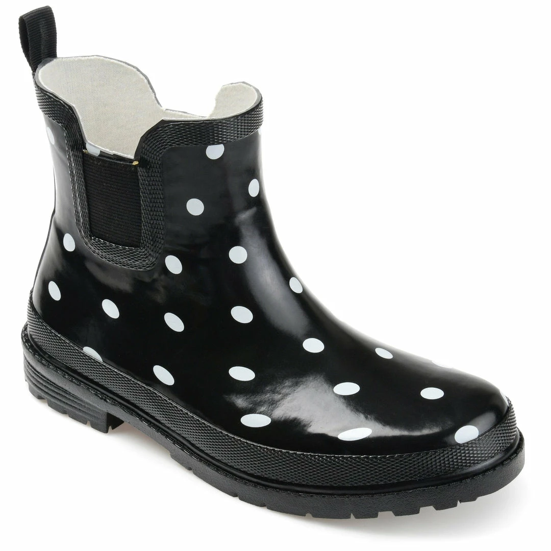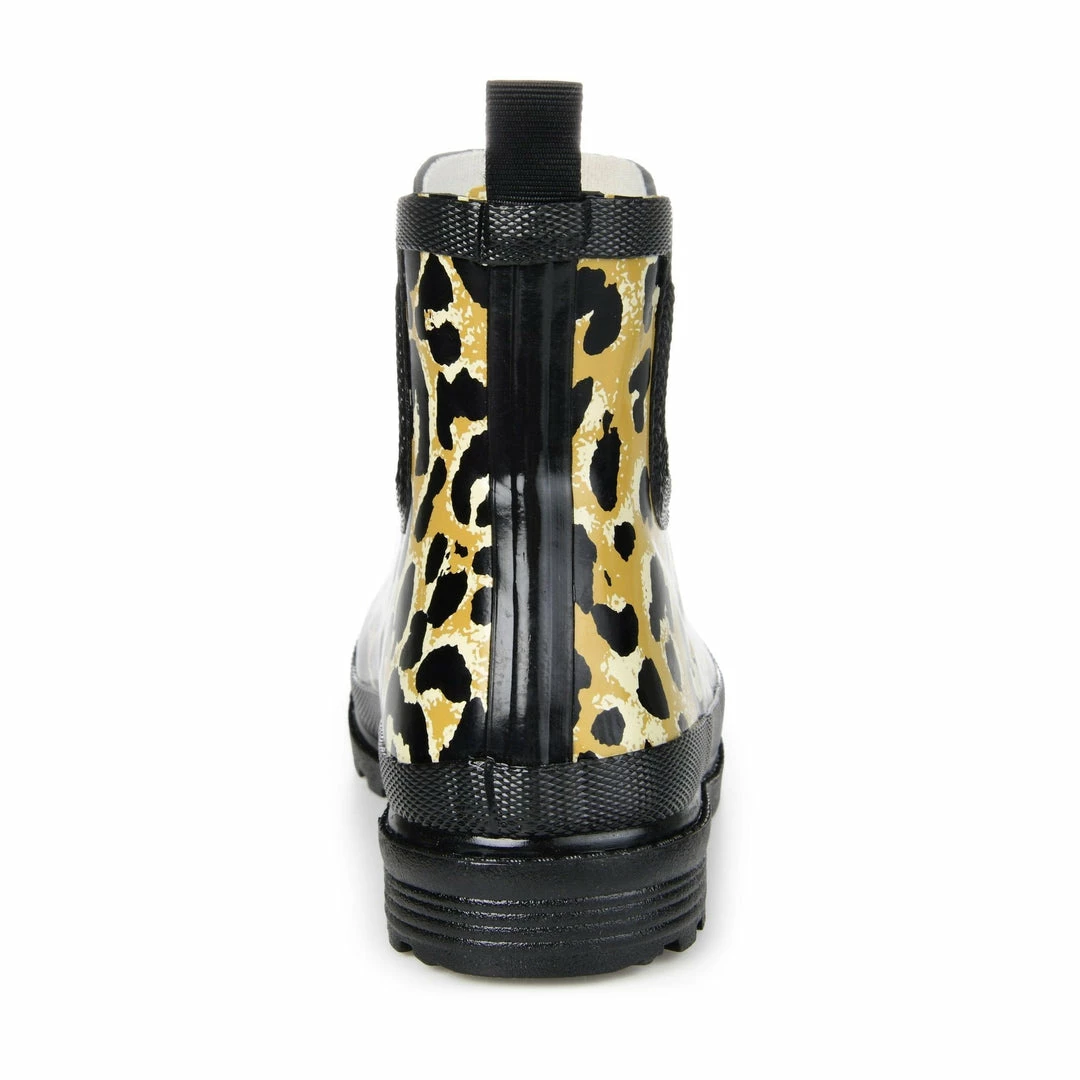 A lively print and a textured sole detail this waterproof rain boot. Stretch goring on either side and an ankle-high cut finishes the look for a flexible, comfortable fit.