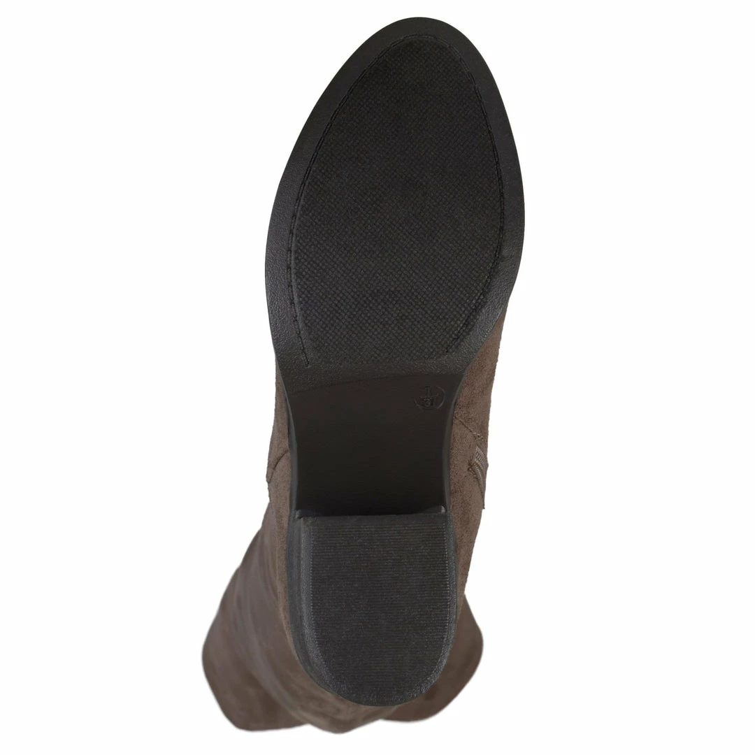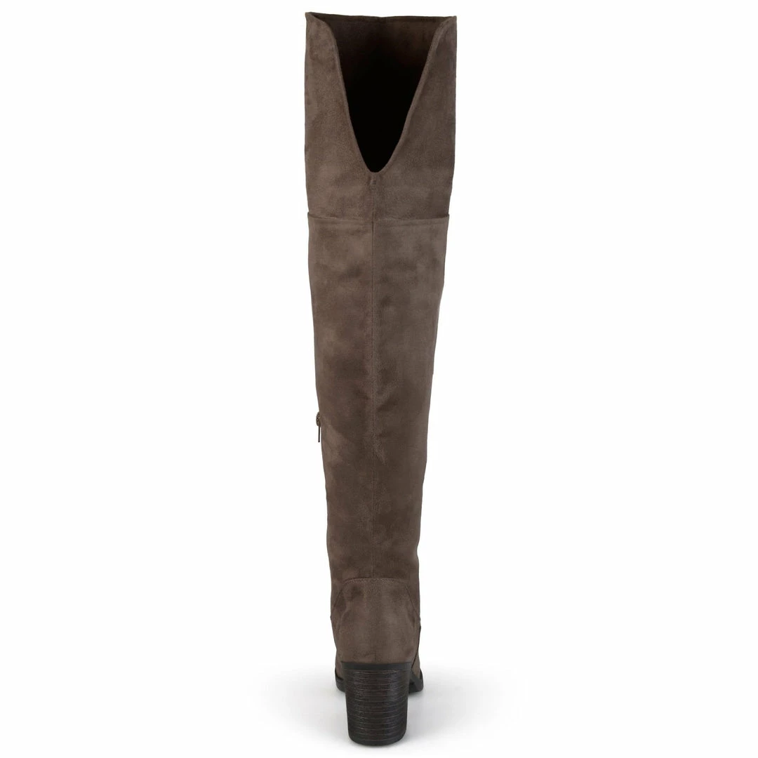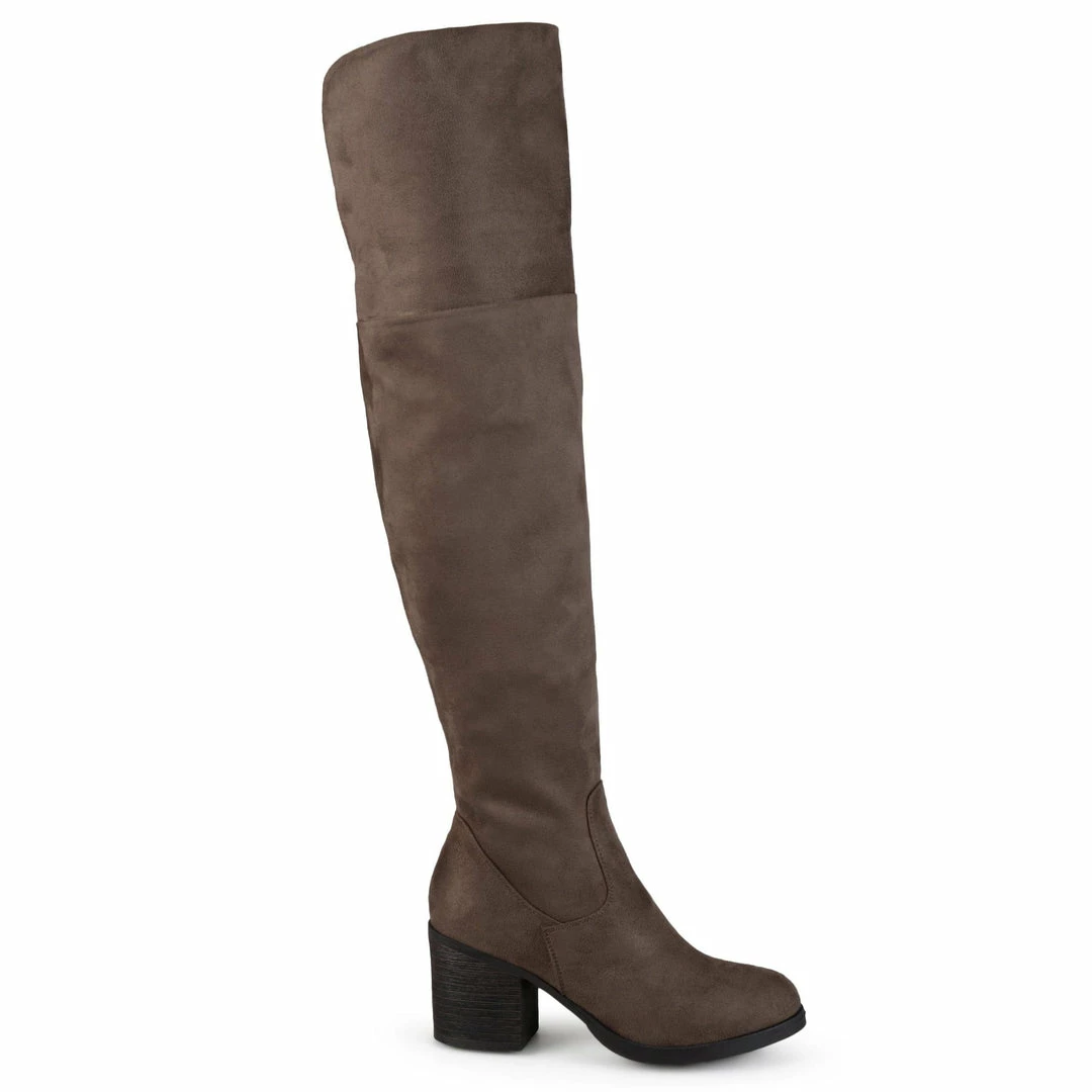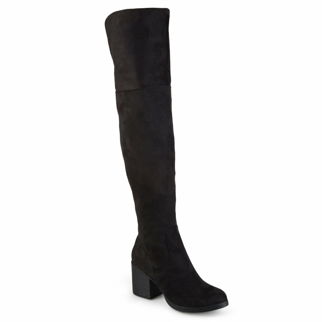 A round-toe over-the-knee boot made with soft and flexible vegan suede uppers finished with a smart zipper entry and a dramatic stacked block heel.