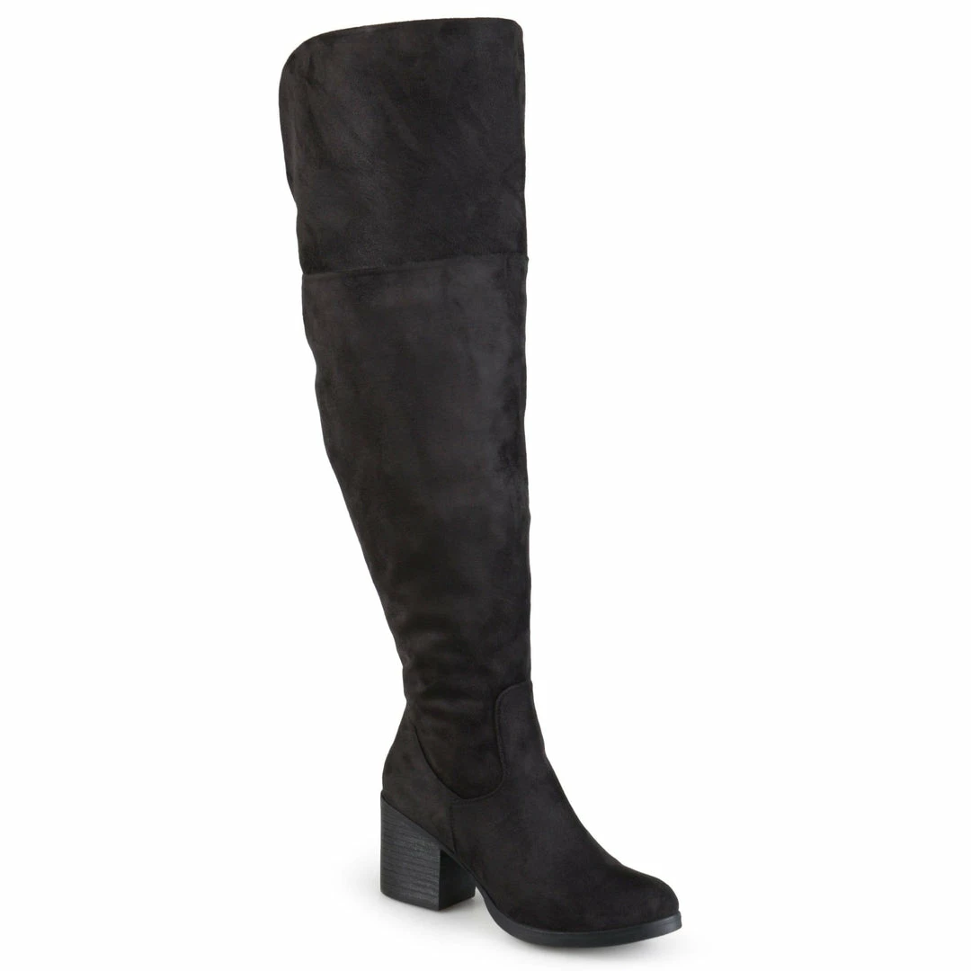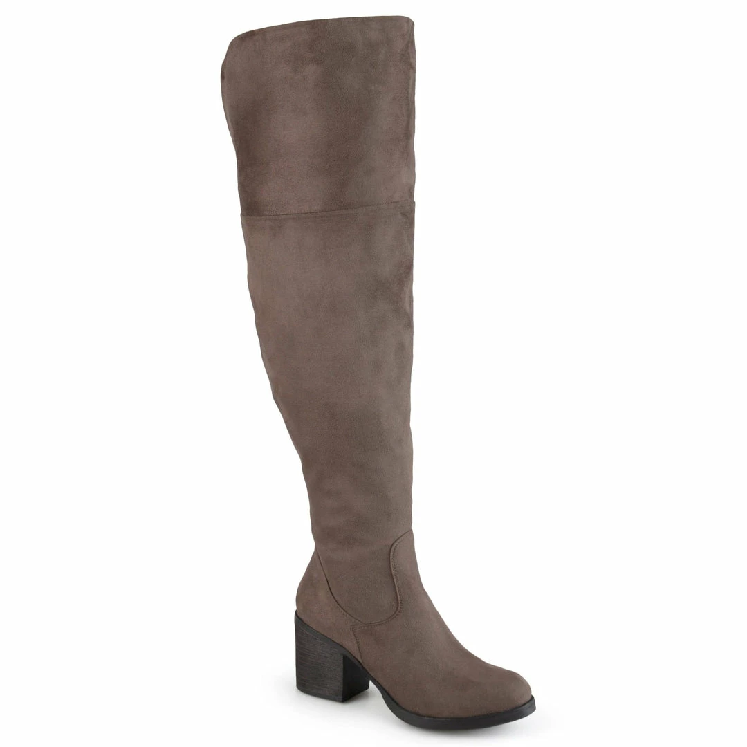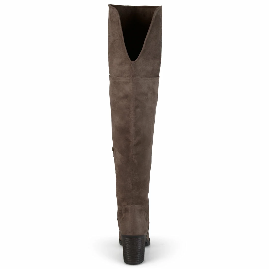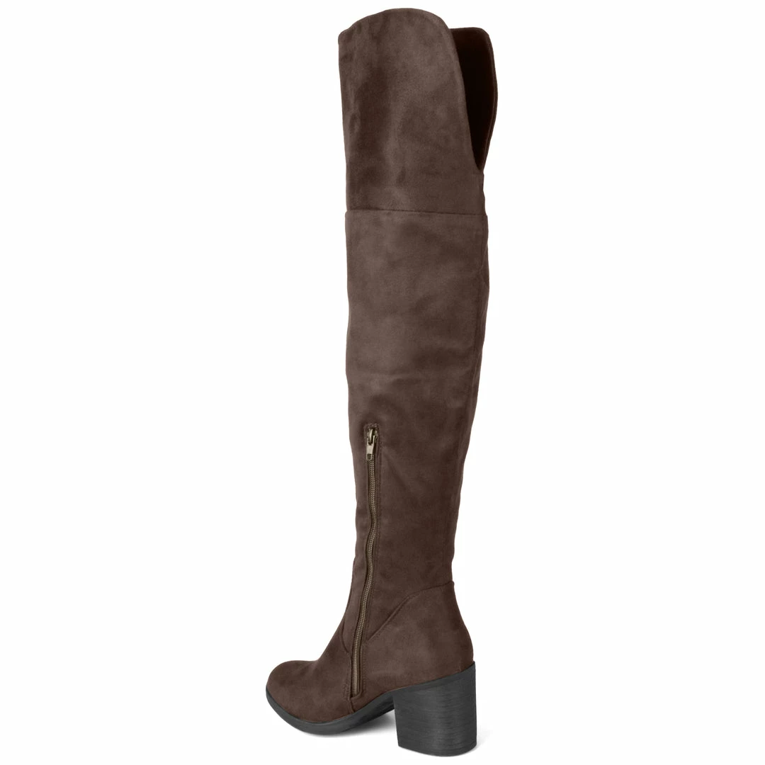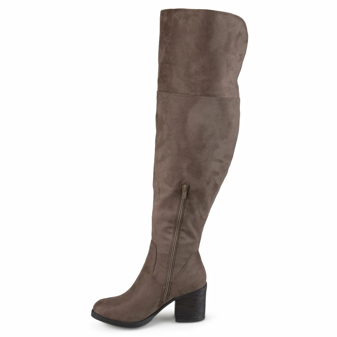 An over-the-knee wide calf boot with an elevated off duty vibe rendered with supple vegan suede mounted on a block heel.