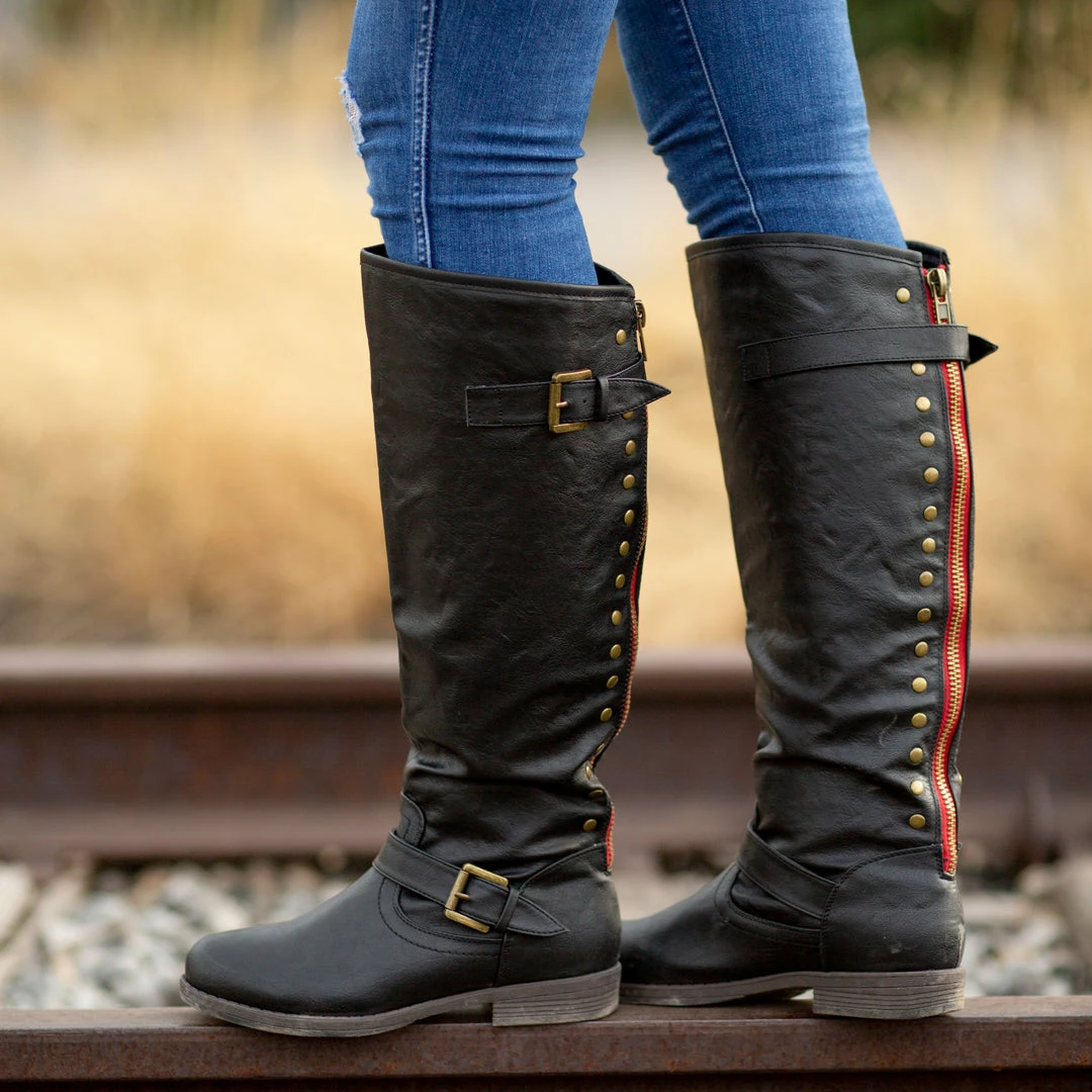A red-hot exposed zipper enhanced with studded details border this essential knee-high riding boot detailed with soft vegan leather uppers and a wide-calf topped with buckle accents for a traditional look.