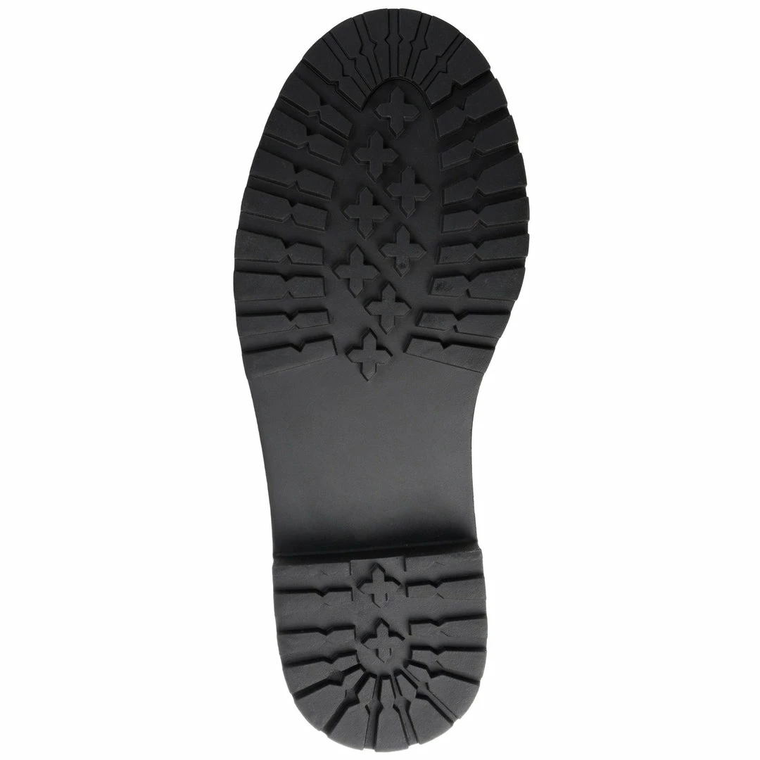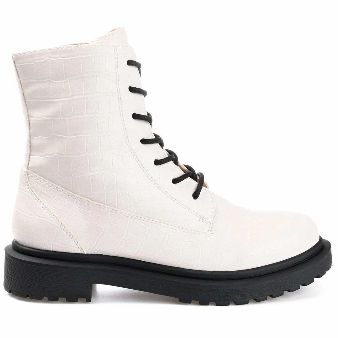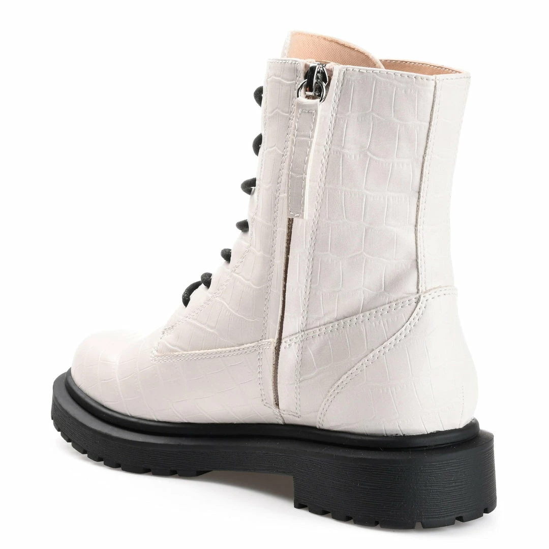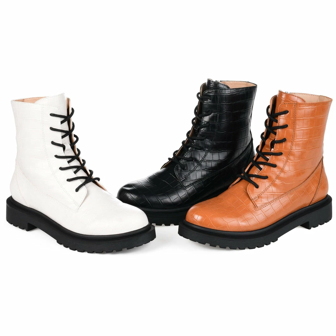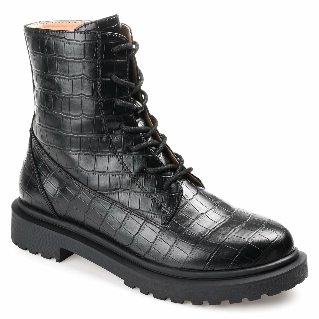 A retro combat bootie with croc textured vegan leather, and a low block heel for a femme take.
