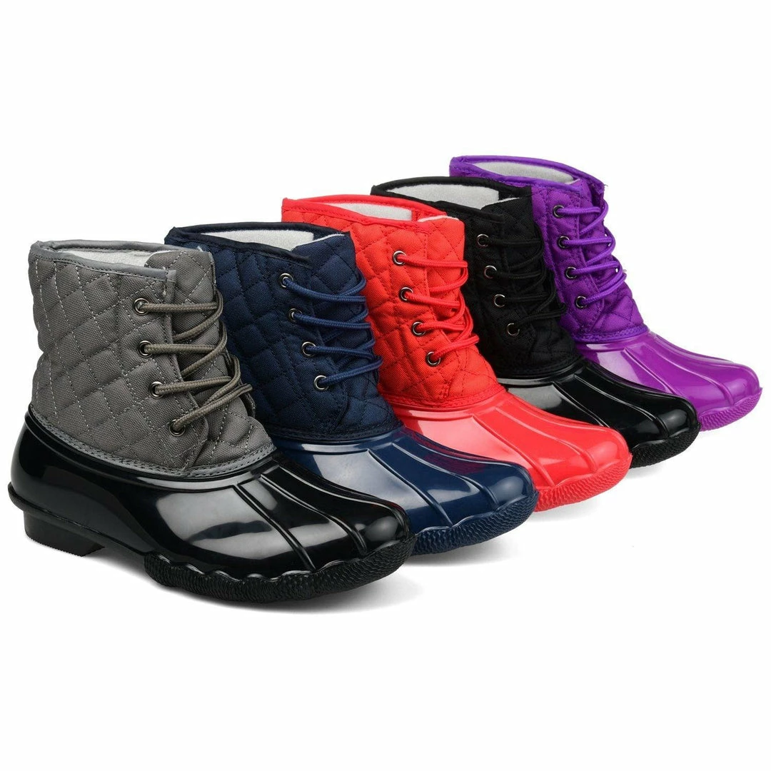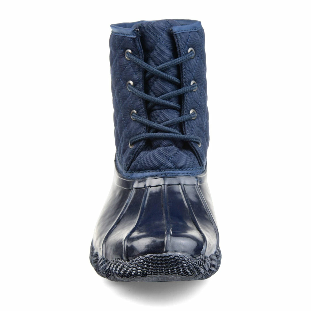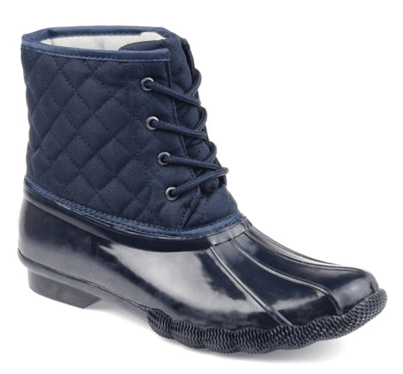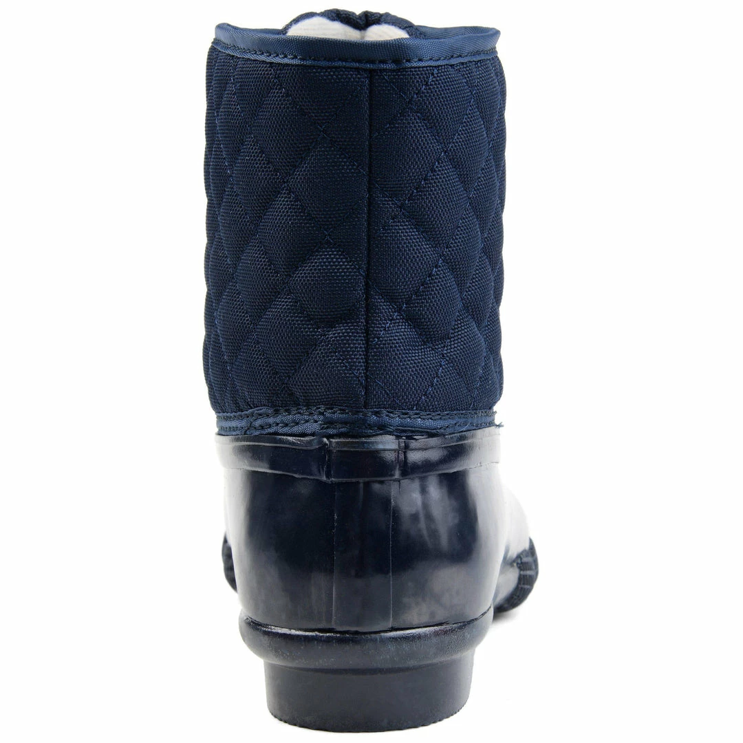 Stay dry in this essential two-tone duck foot boot with a rubber vamp and traction sole. This storm-proof style features a quilted shaft secured by a lace-up detail, keeping you warm and cozy.