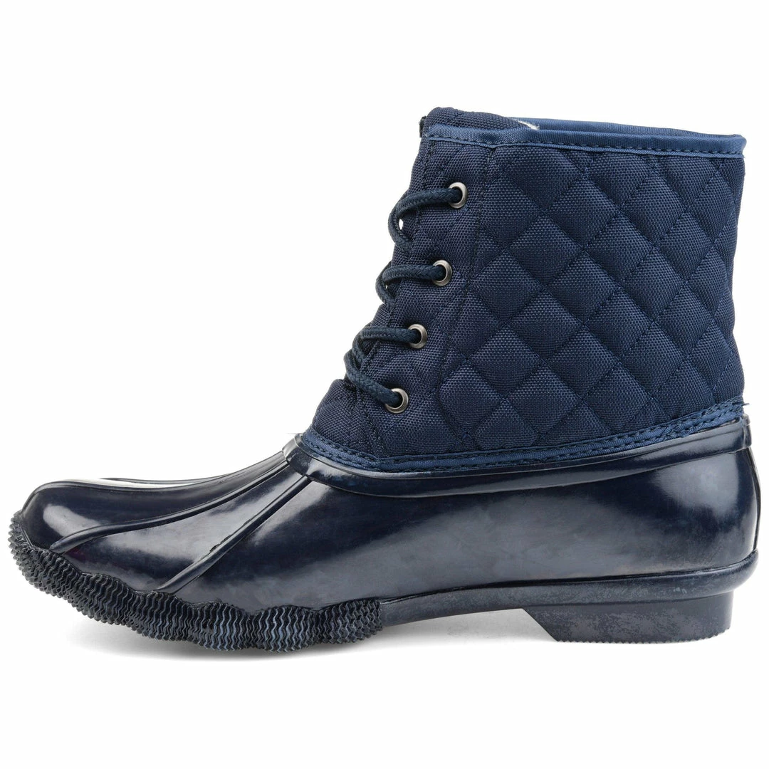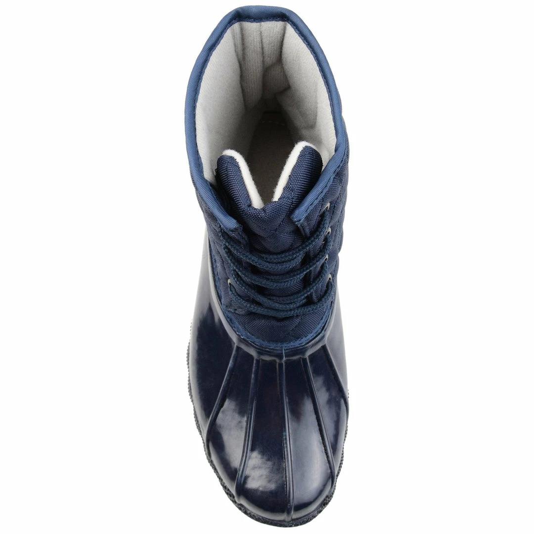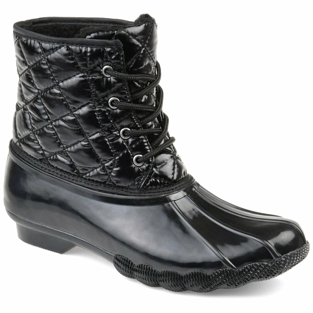 Stay dry in this essential two-tone duck foot boot with a rubber vamp and traction sole. This storm-proof style features a quilted shaft secured by a lace-up detail, keeping you warm and cozy.