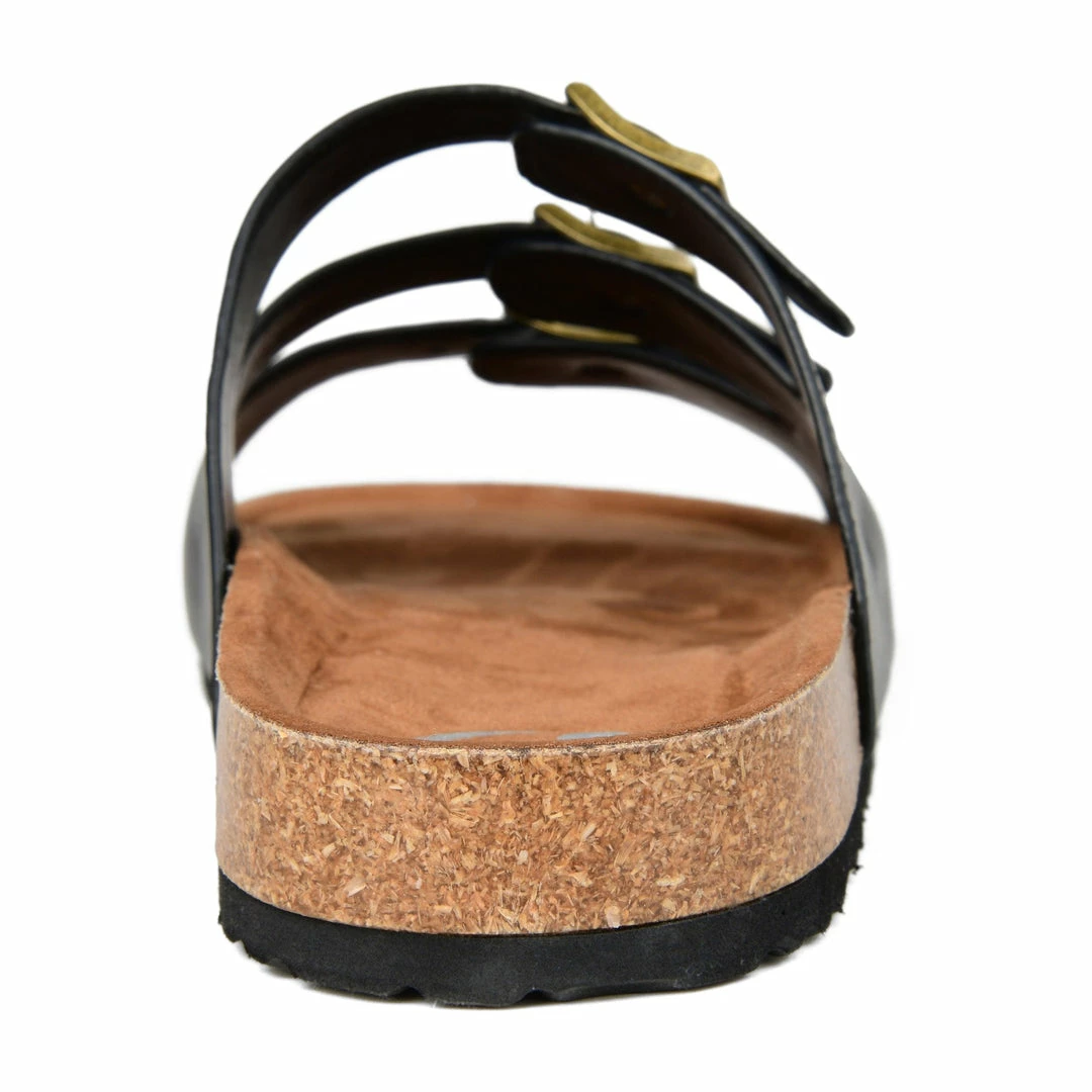 Comfort never looked so good, this triple strap sandal with three square buckles feature vegan leather uppers and an open toe. With a flexible synthetic cork outsole and soft fabric lined footbed, you’ll be happy to wear these all day long.