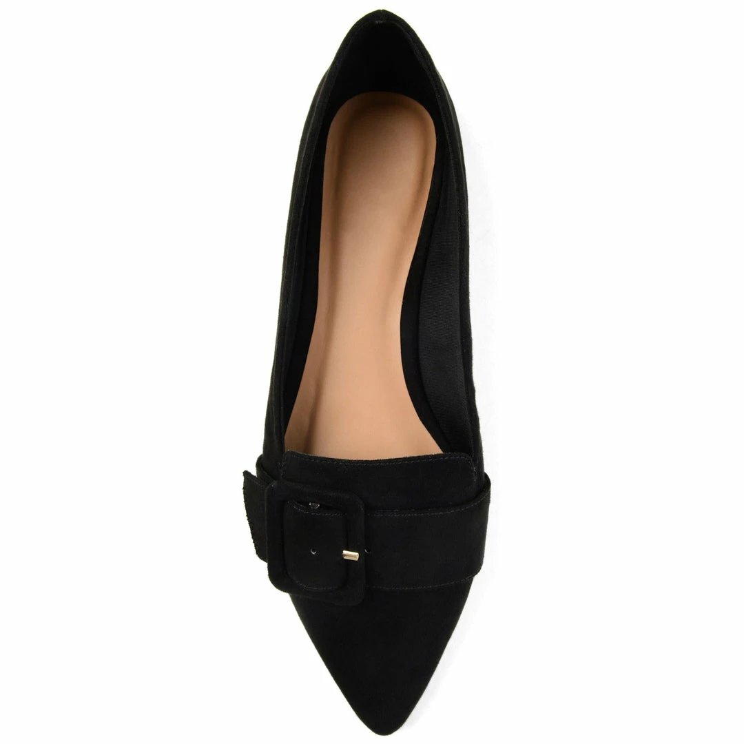 An effortless essential flat embellished by a pointed-toe design and an oversized square buckle. This velvety vegan suede silhouette rests on a padded footbed for long-lasting comfort.