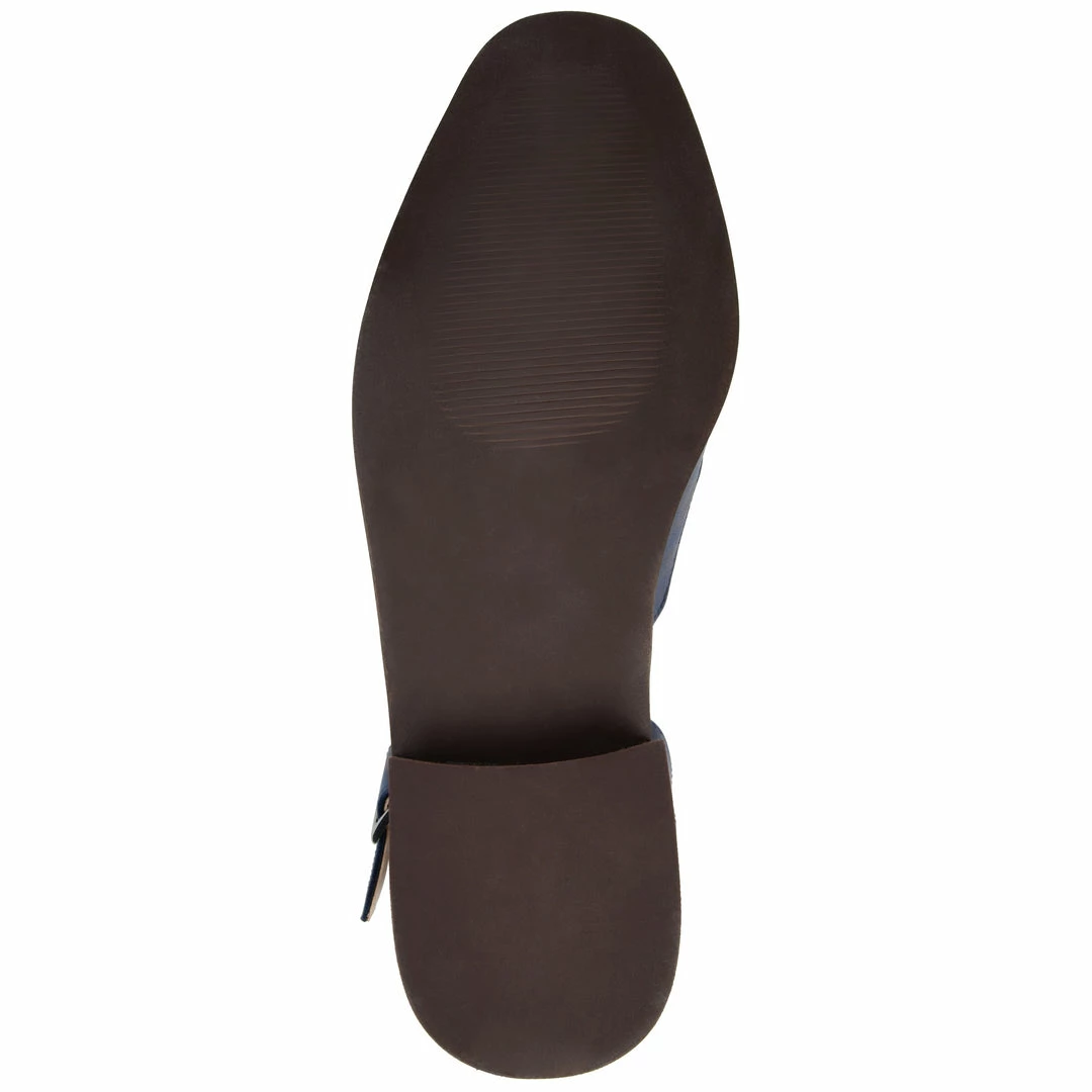 A dreamy “back-to-school” inspired loafer flat detailed with a buckled strap and tiny stacked heel for a subtle lift.