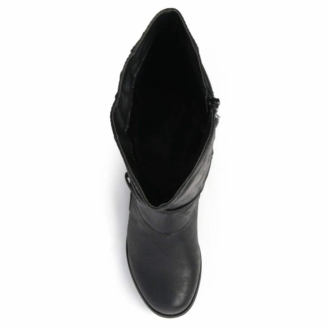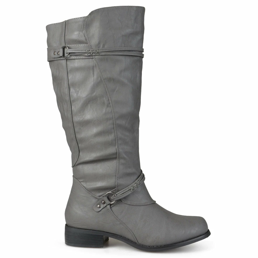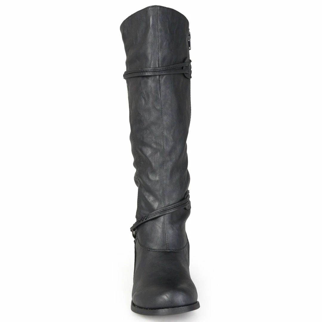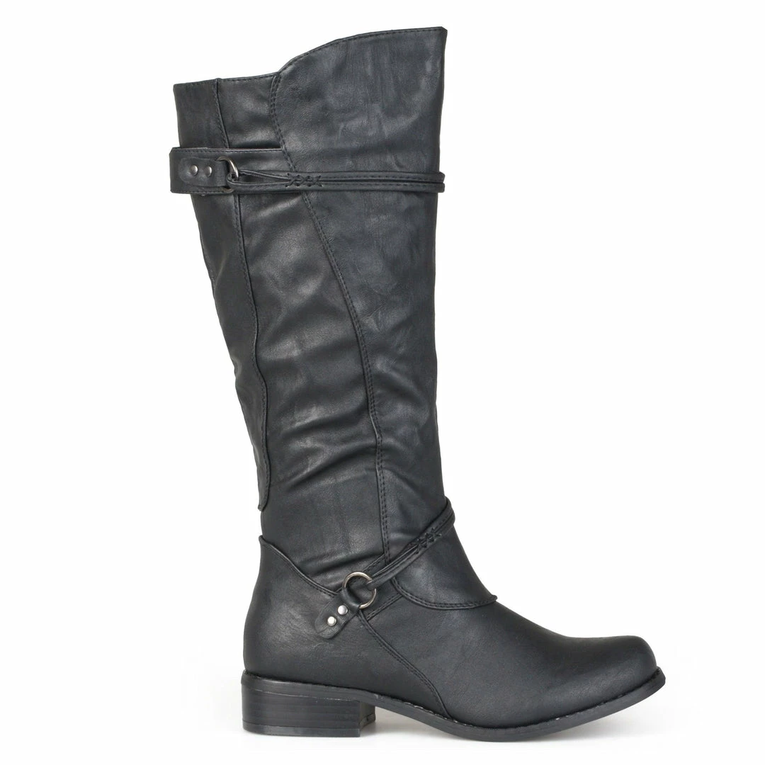 A strap and loop design wraps around the shaft of this round-toe wide-calf riding boot for a motorcycle-inspired look finished with vegan leather, a low stacked heel, and a comfortable padded footbed.