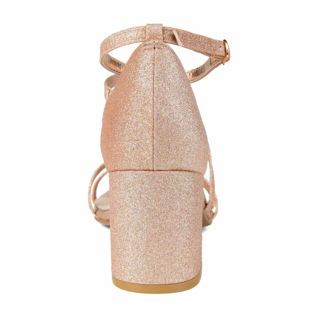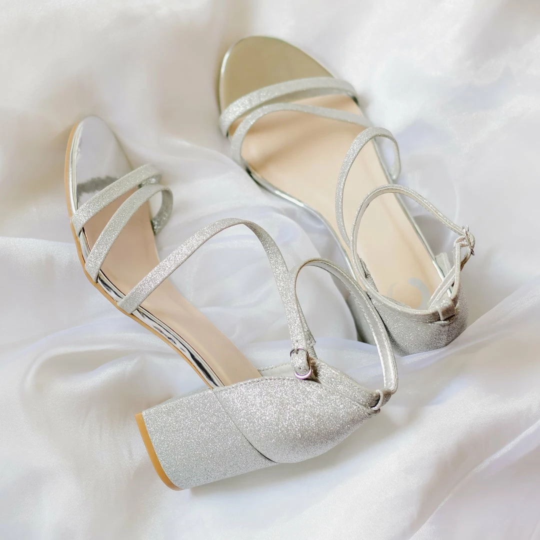 Shimmering glitter materials shape this ravishing special occasion sandal. This elevated look features blocked heels and a dual toe strap alongside an asymmetrical band attached at the cuff for a contemporary look.