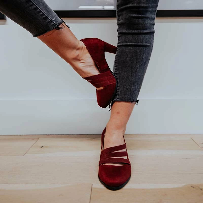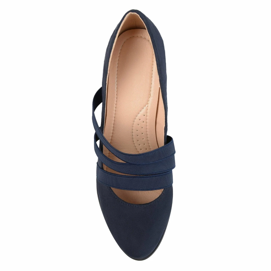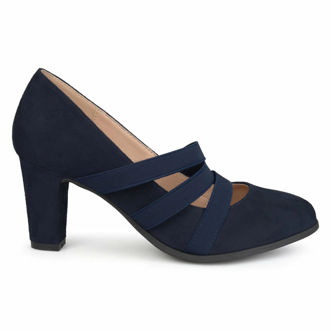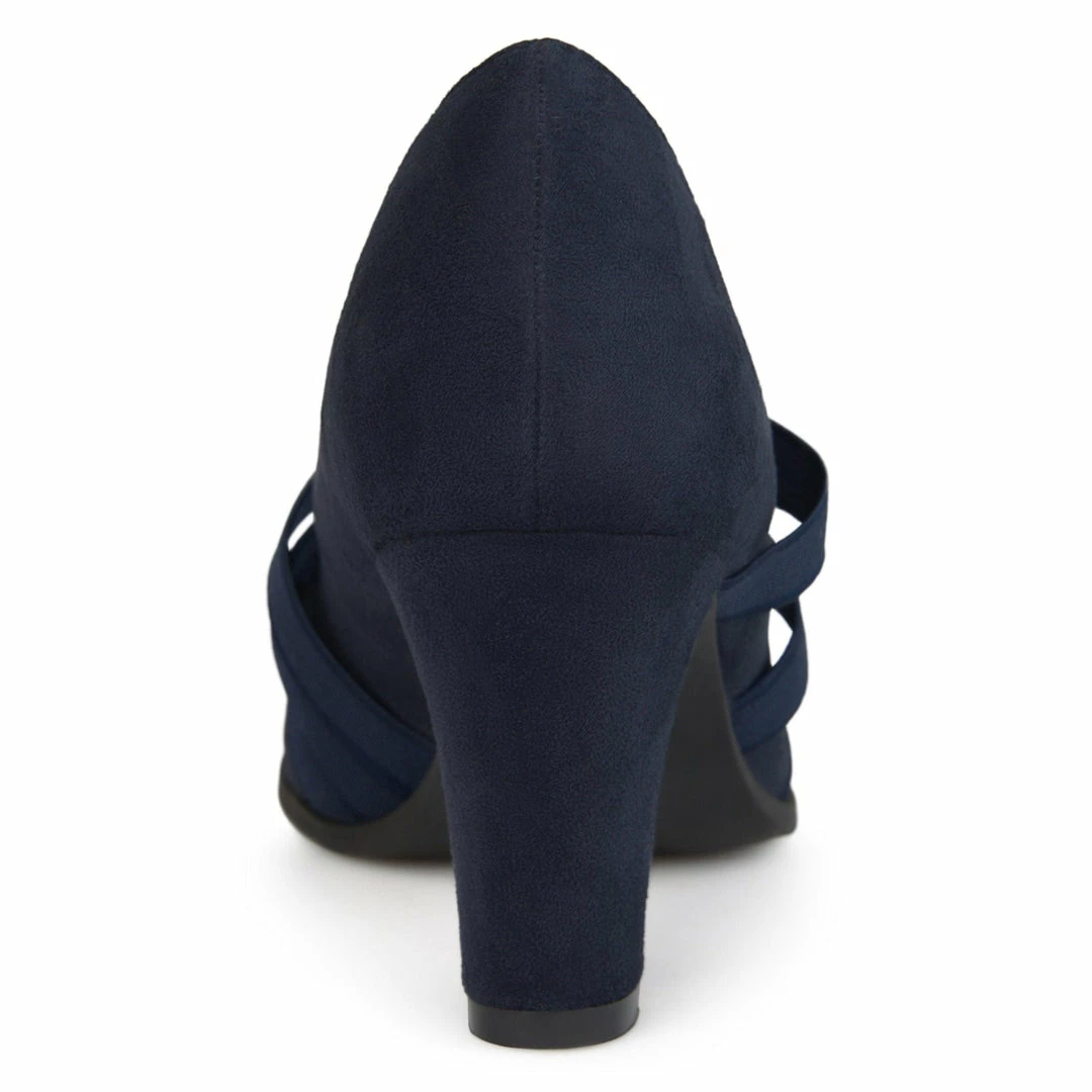 Triple stretch straps furnish the vamp of this classic round-toe pump featuring a comfortable insole and velvety vegan suede uppers.