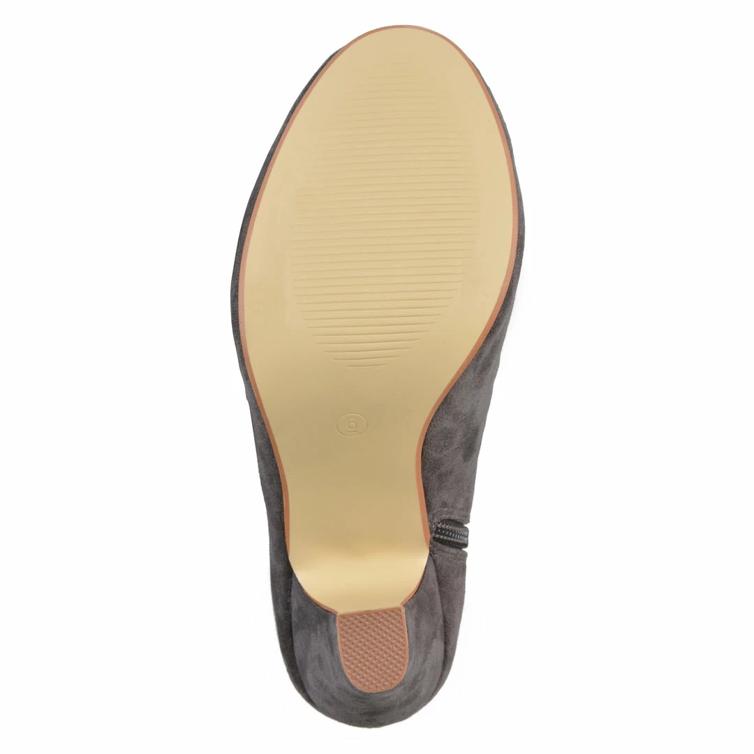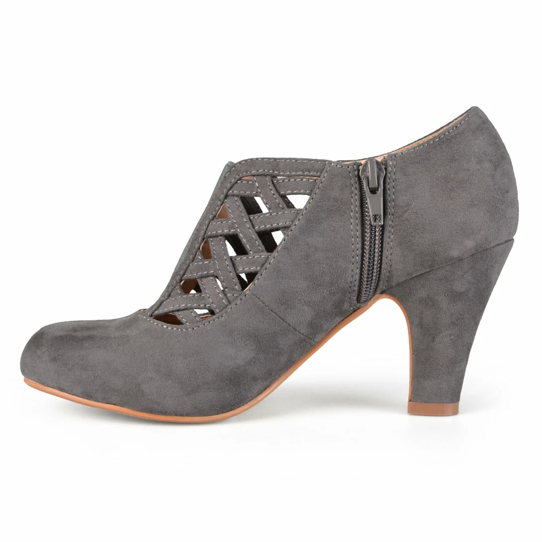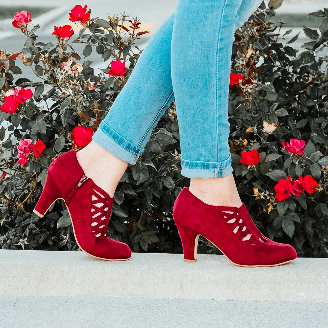 A crisscross design and stretch panel embellishes the vamp of this block-heeled bootie. Soft vegan suede, a smooth zipper entry, and a padded footbed finish this darling vintage heel.