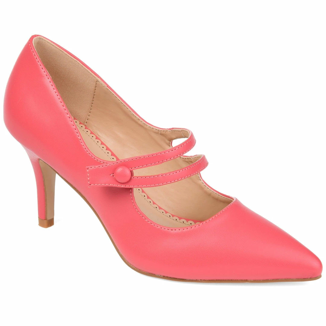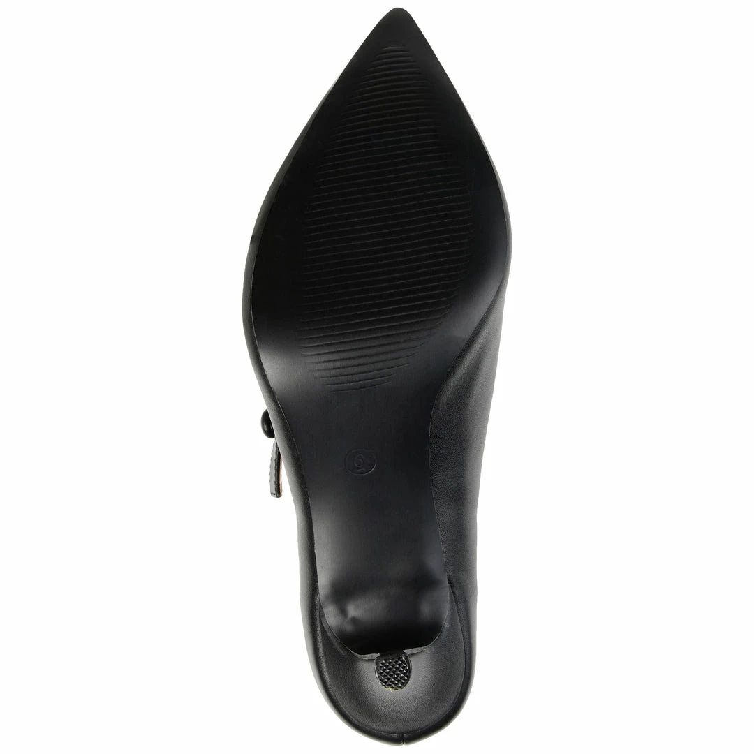 A covered button closure and a pointed-toe add a modern touch to this Mary Jane pump. A slender heel and padded footbed complete this vegan leather design.