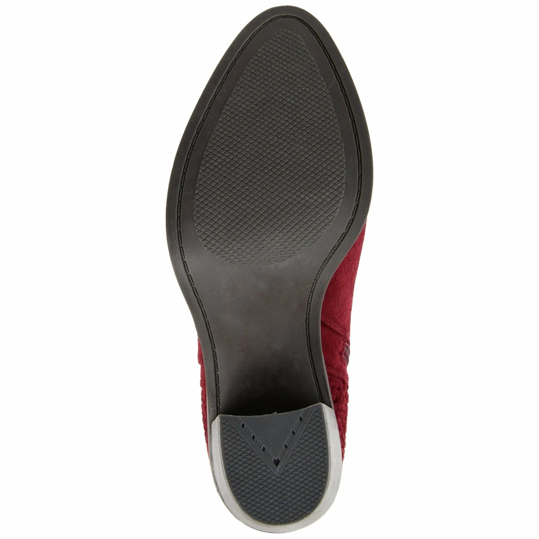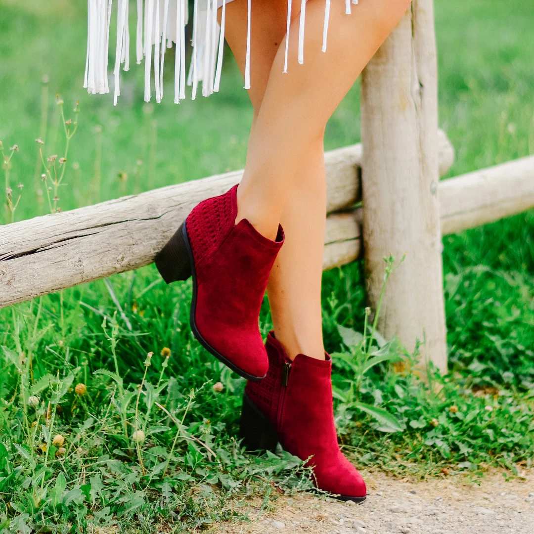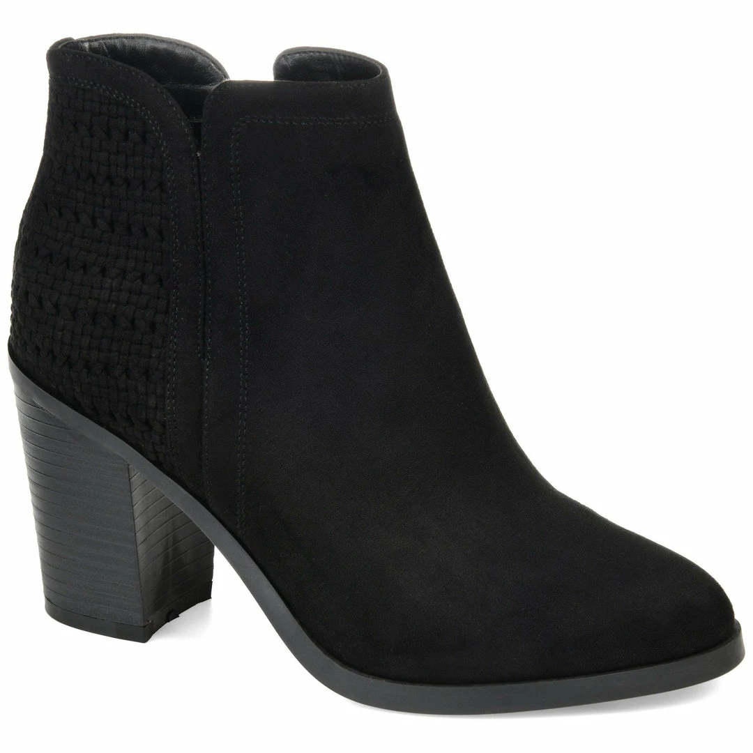 A versatile almond-toe bootie featuring vegan suede uppers with a woven accent at the heel, an inside zipper, and a lofty stacked heel.
