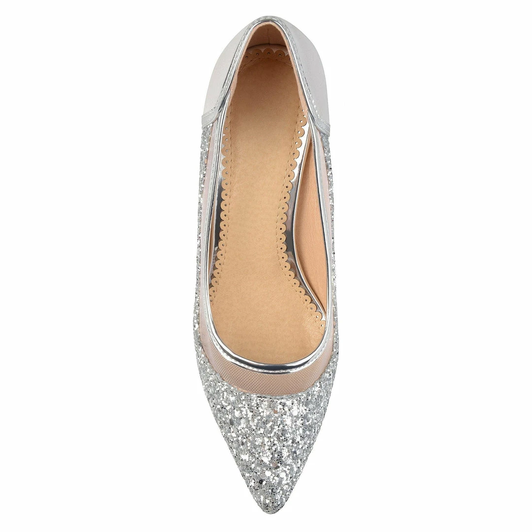 Mesh and glitter-covered man-made uppers paired with a shiny patent border elegantly finish this pointed-toe pump.