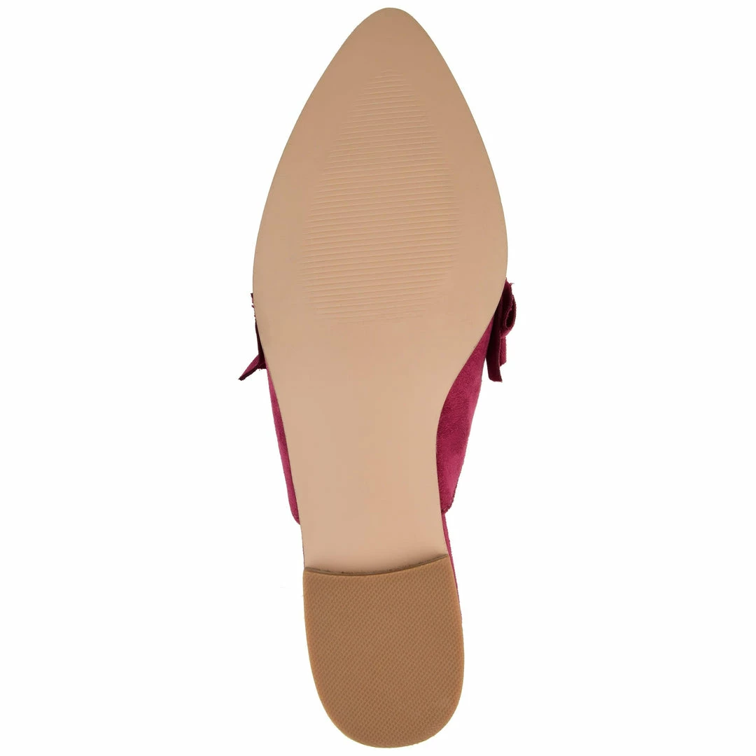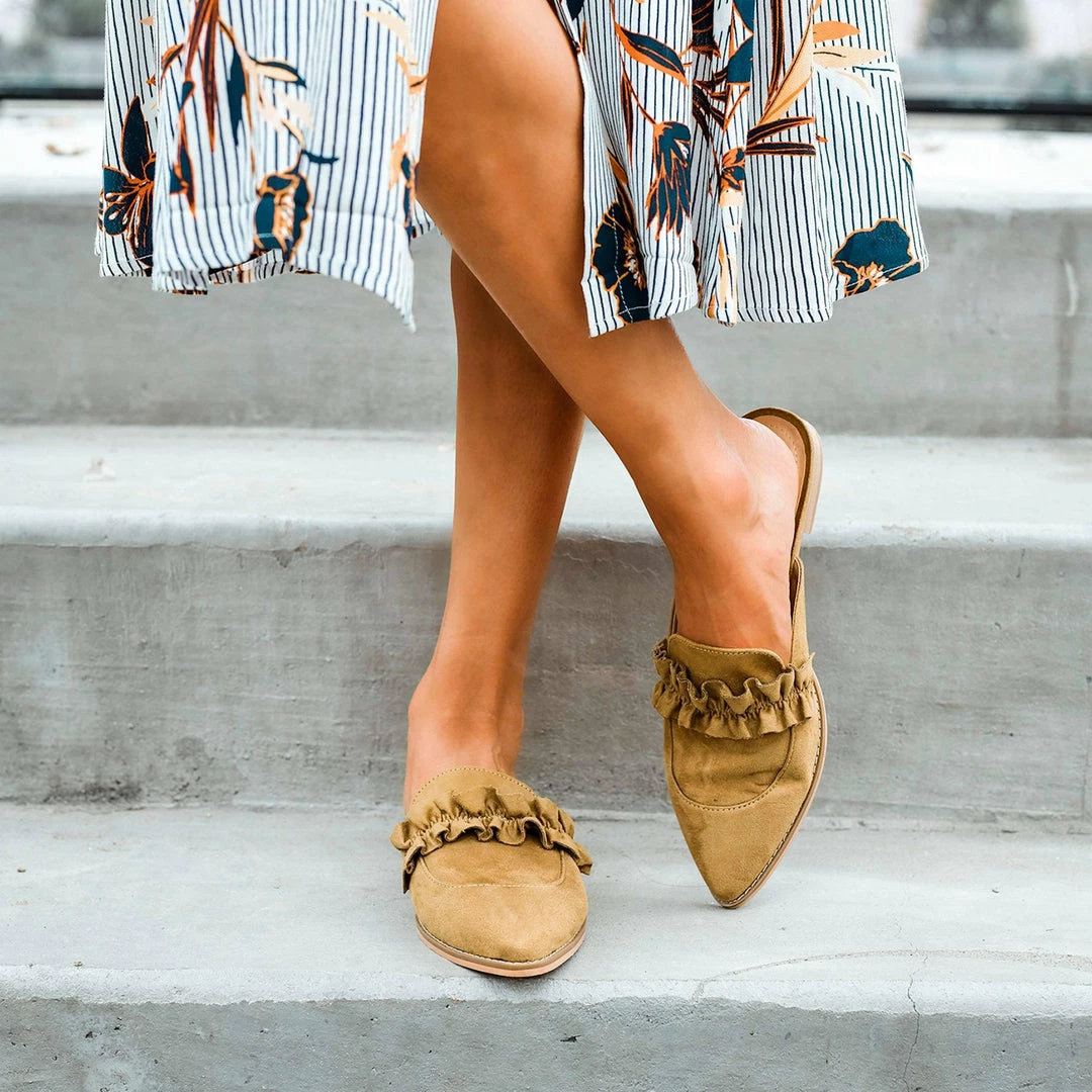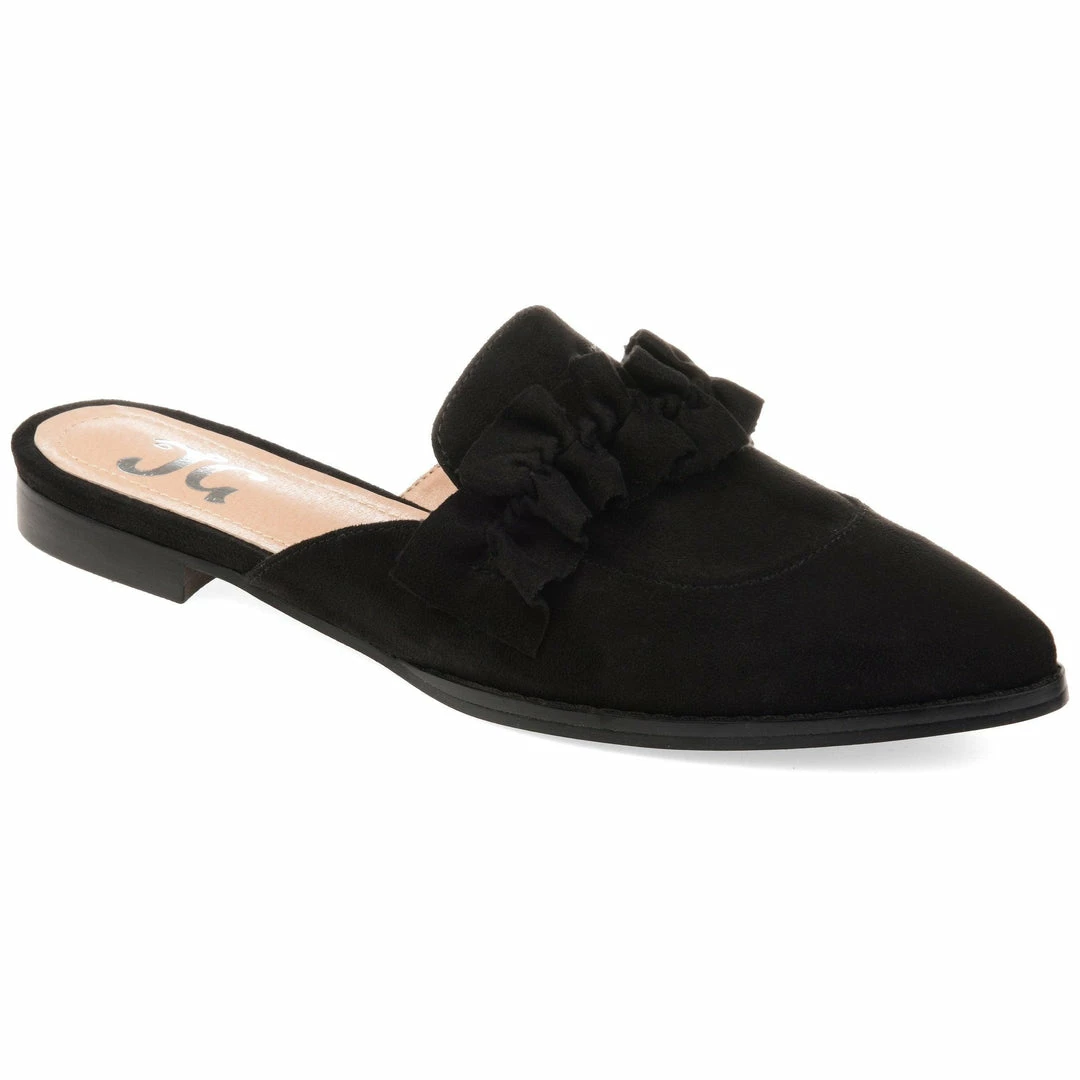 This velvety soft-microsuede pointed-toe slip-on flat is garnished with a sassy ruffled accent at the vamp.