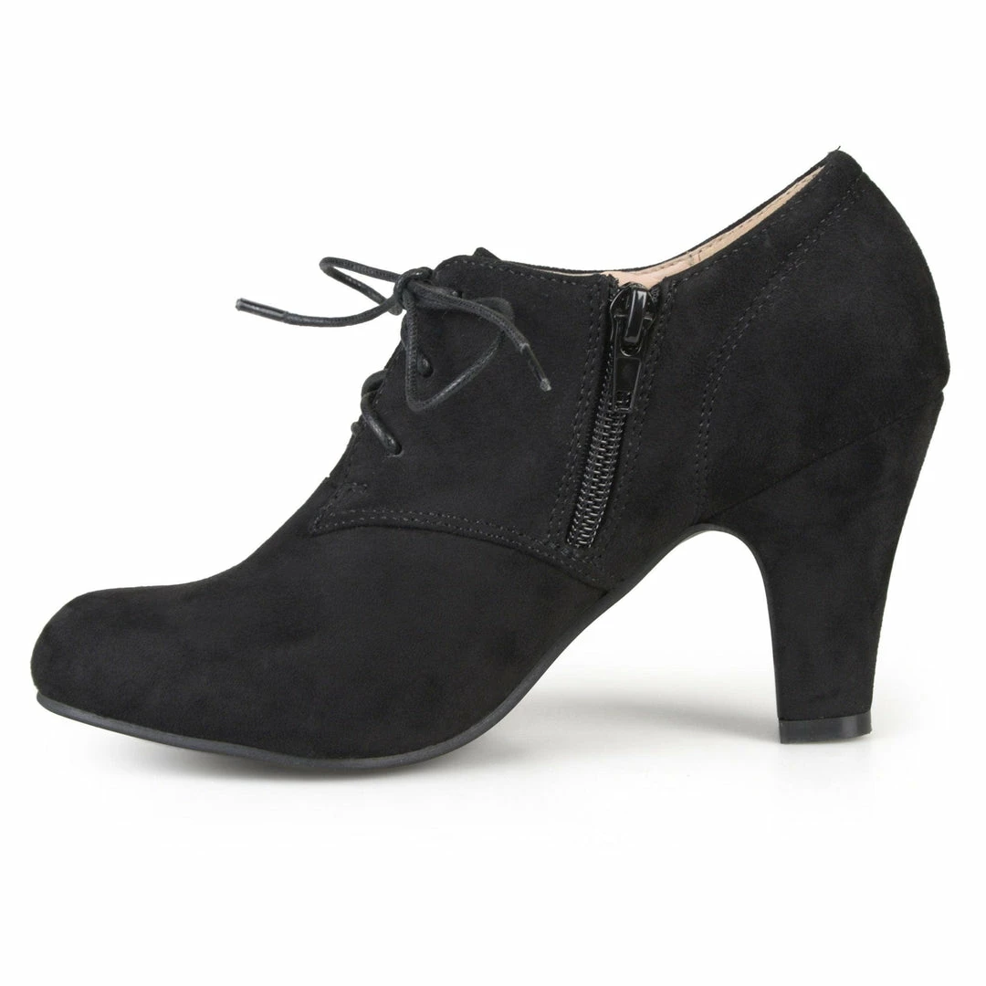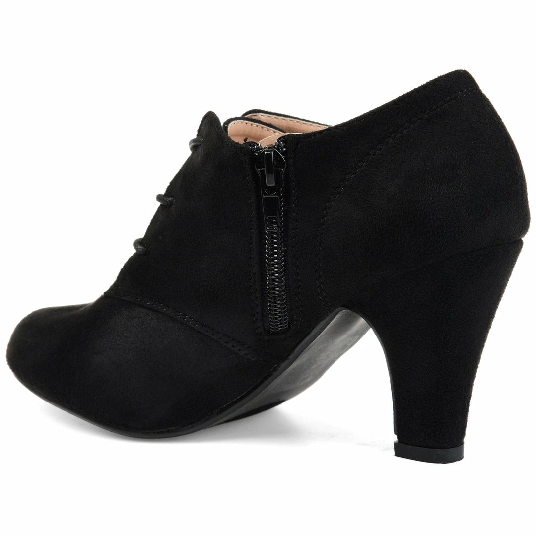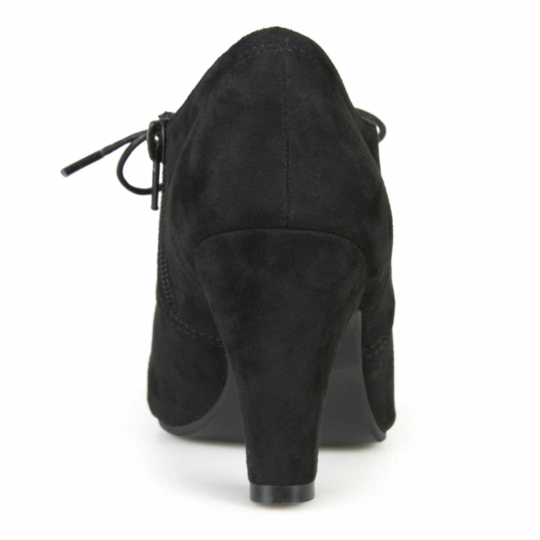 A wide-width round-toe lace-up bootie featuring soft vegan suede uppers elevated by pump heels for a vintage feminine look.