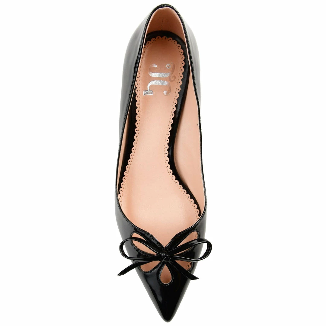 A mid-century inspired pointed-toe kitten heel detailed with glossy patent vegan leather, tear-shaped cutouts, and a darling bow at the tip of the vamp.