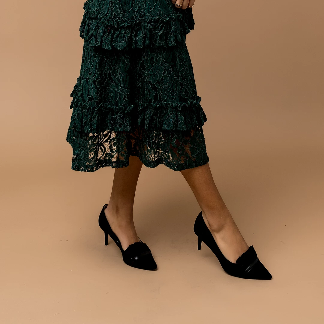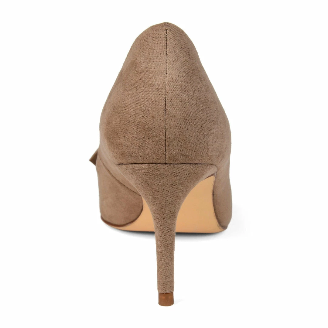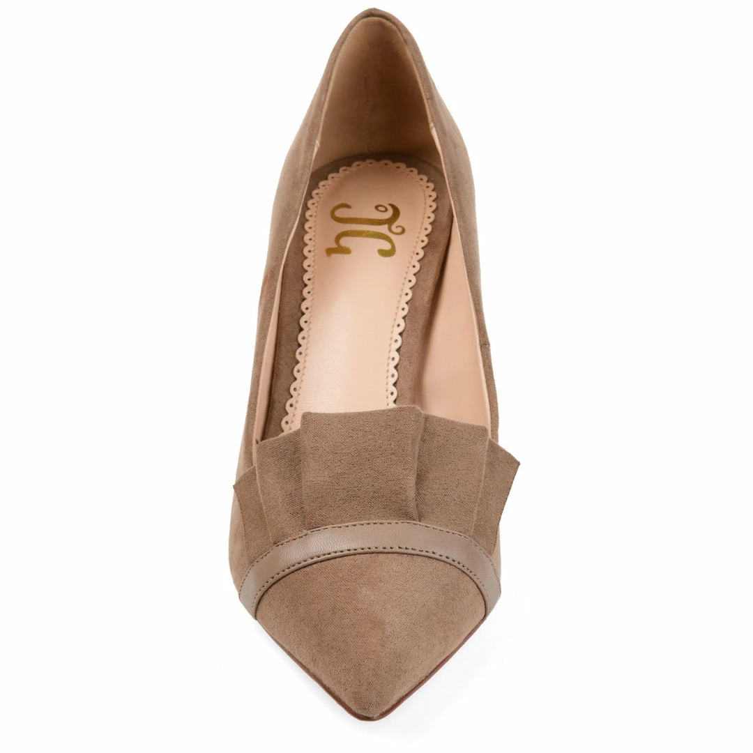 A dreamy pointed-toe pump composed with soft vegan suede uppers finished with a fanned ruffle accent and a comfortable padded footbed.
