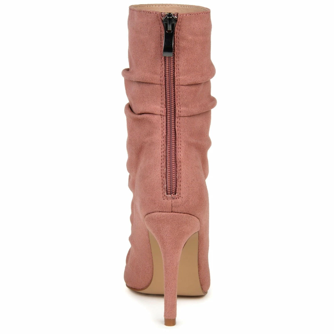 A shapely ankle bootie styled with a pointed-toe and slouchy vegan leather uppers. This foxy look is perfected with a back zipper entry, a slim stiletto heel, and a cushioned footbed.