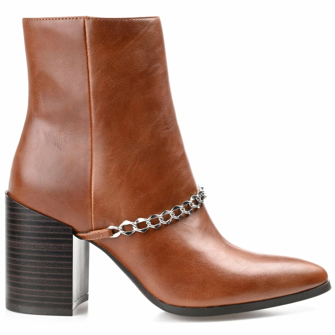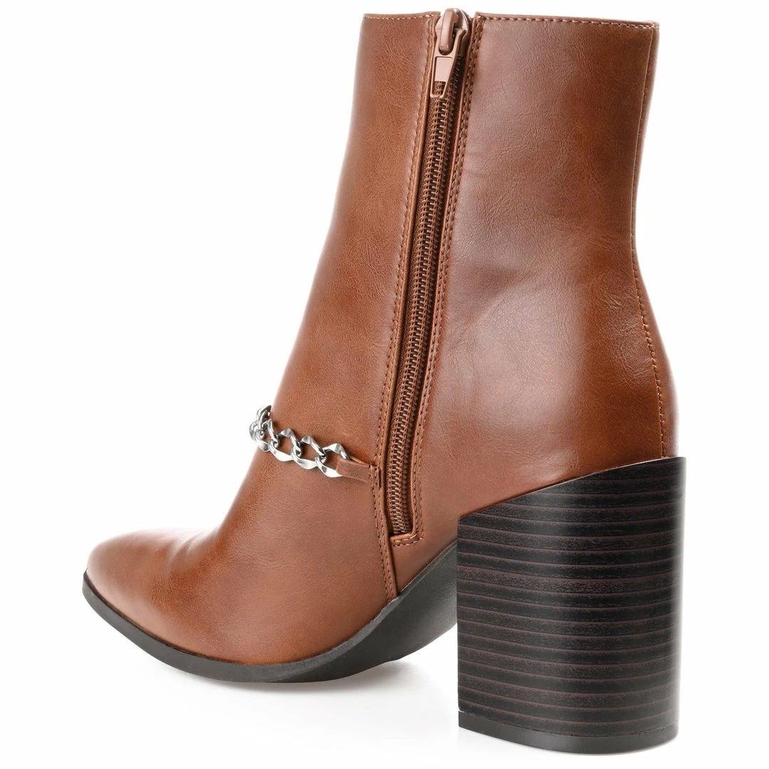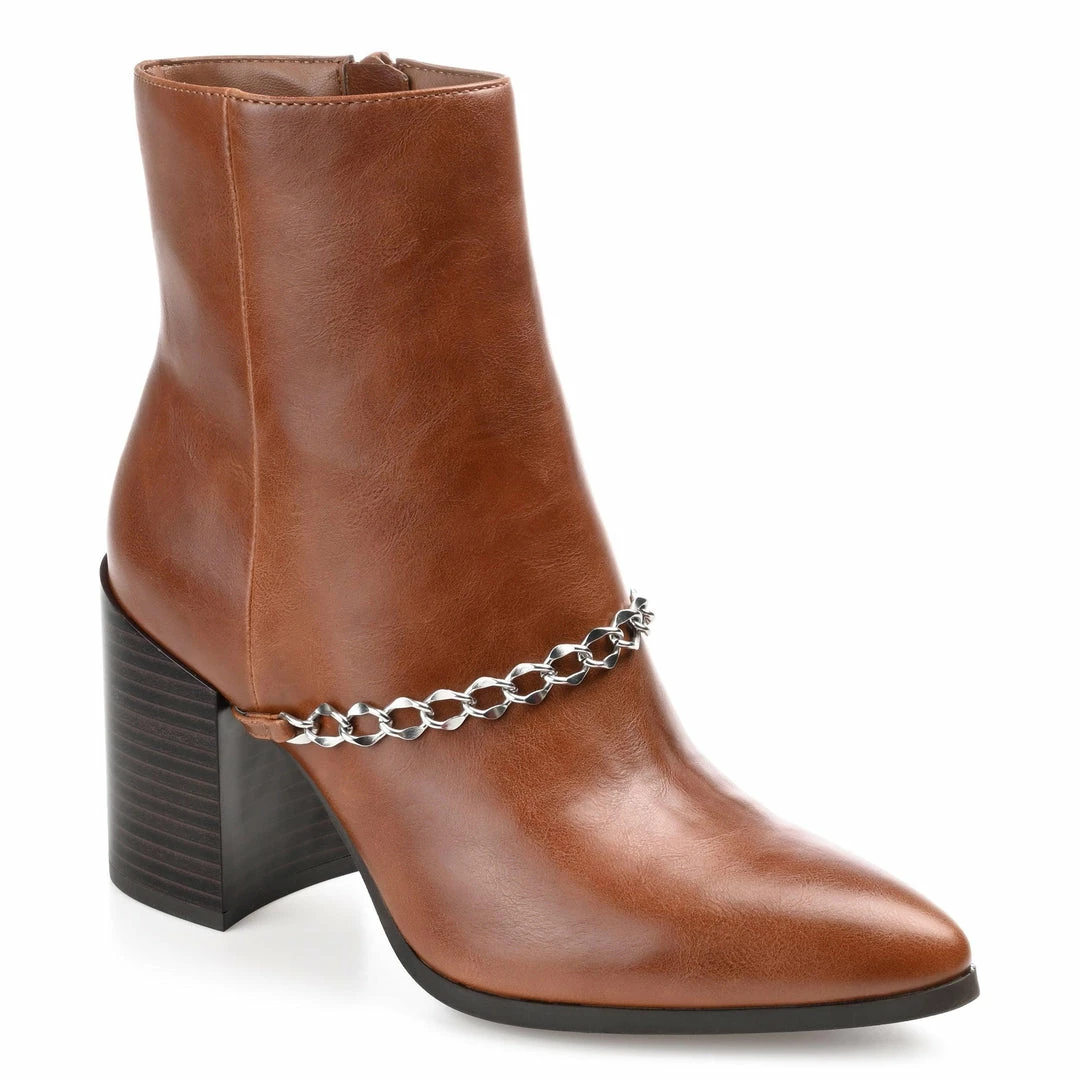 With a chain at the vamp and a lofty block heel, these pointed-toe booties have glam written all over them.