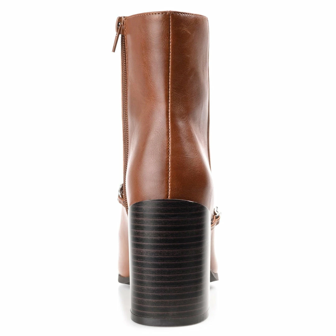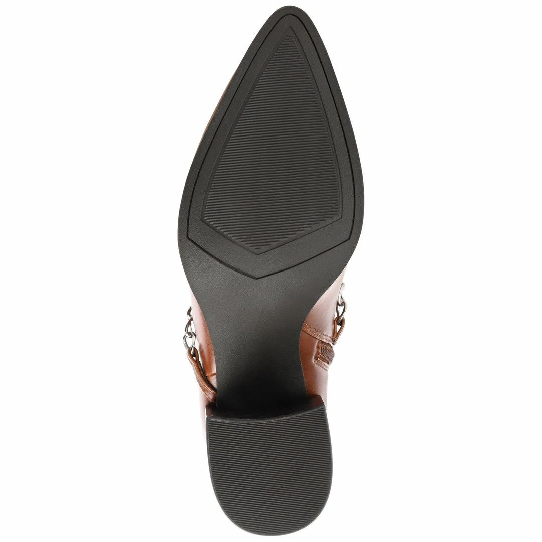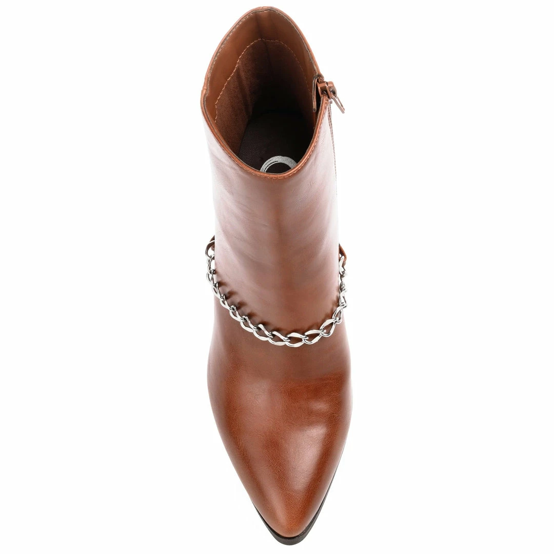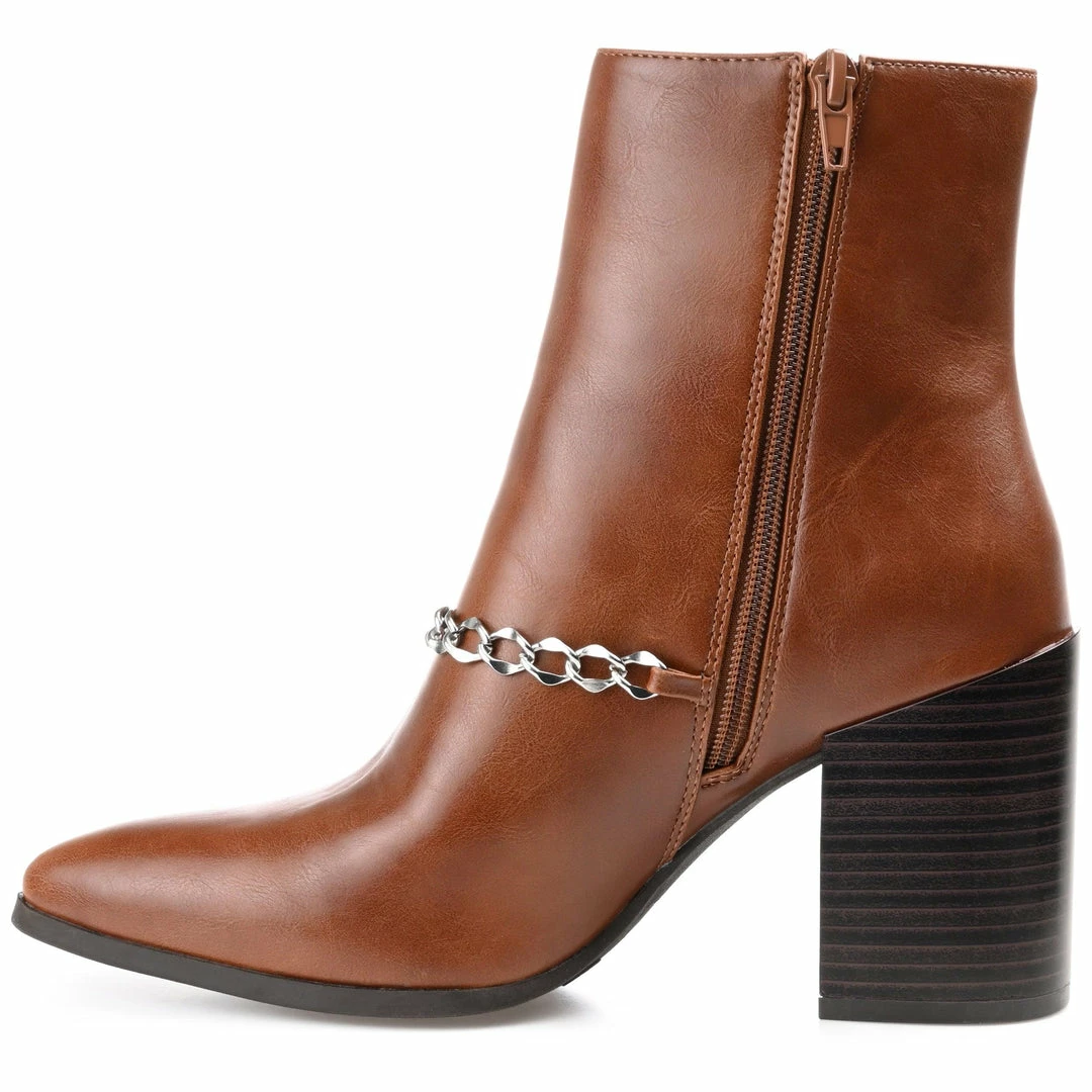 With a chain at the vamp and a lofty block heel, these pointed-toe booties have glam written all over them.