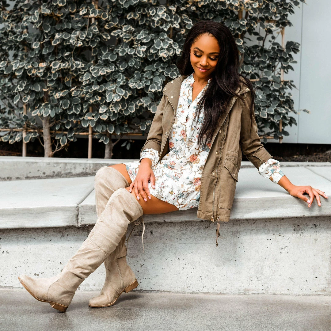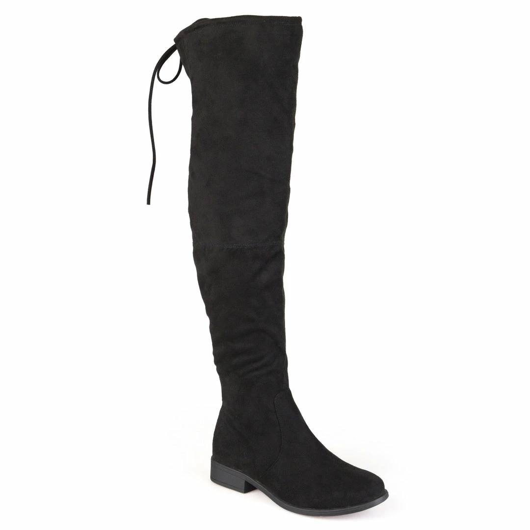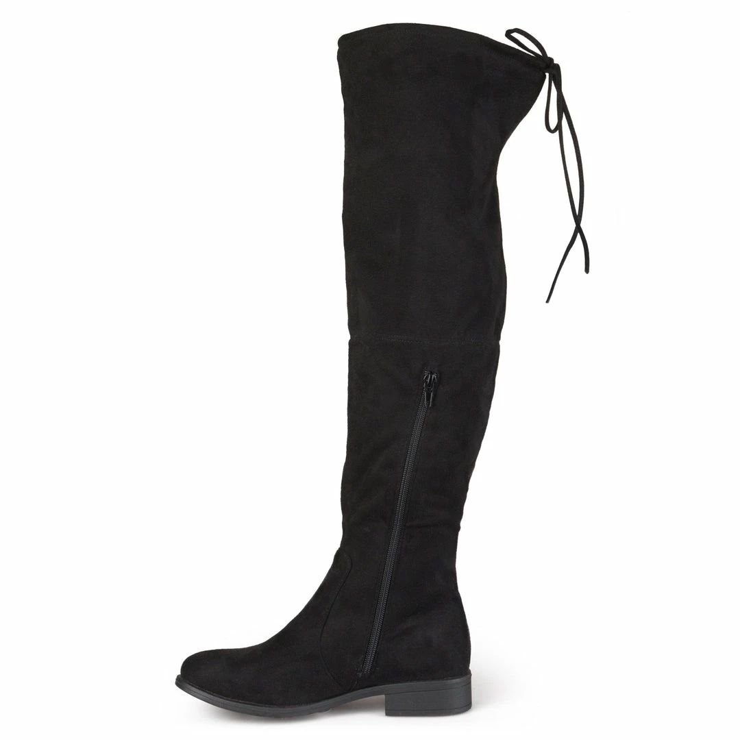A tie-at-the-back closure and low block heel detail this buttery soft vegan suede over-the-knee boot for a foxy look.