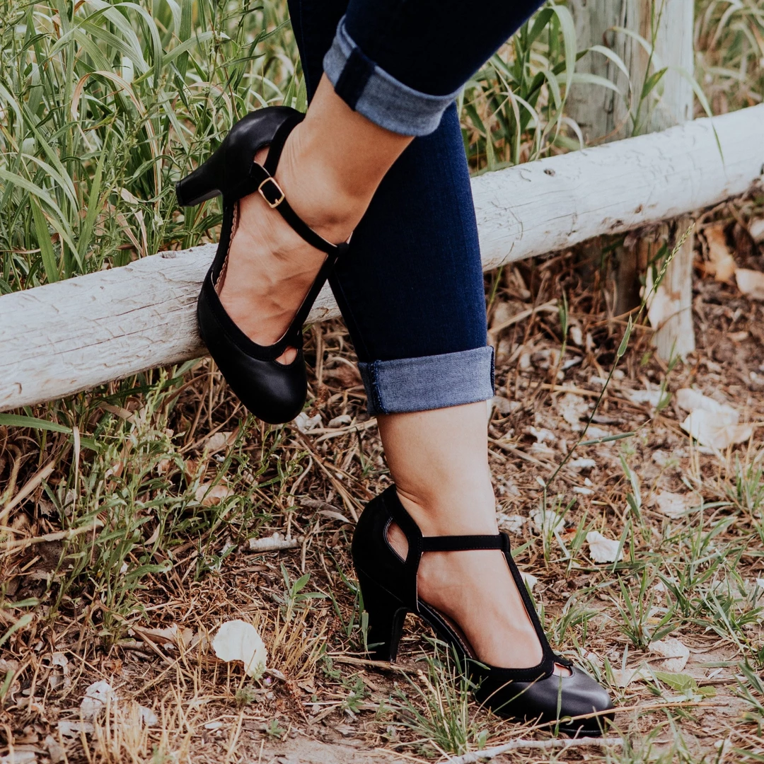 A smooth round-toe T-strap design rendered with supple two-toned vegan leather uppers resting on a pump heel.