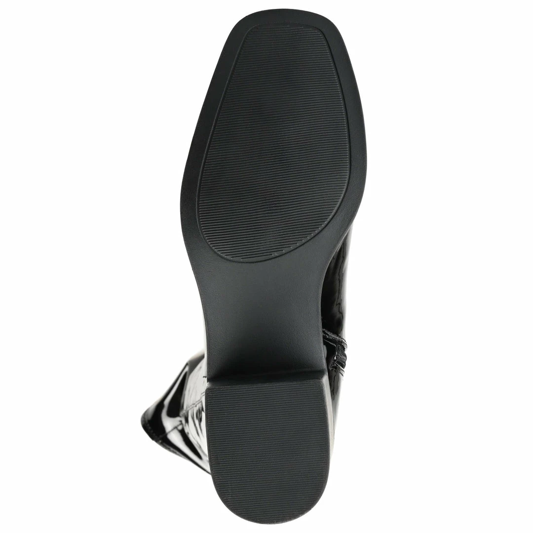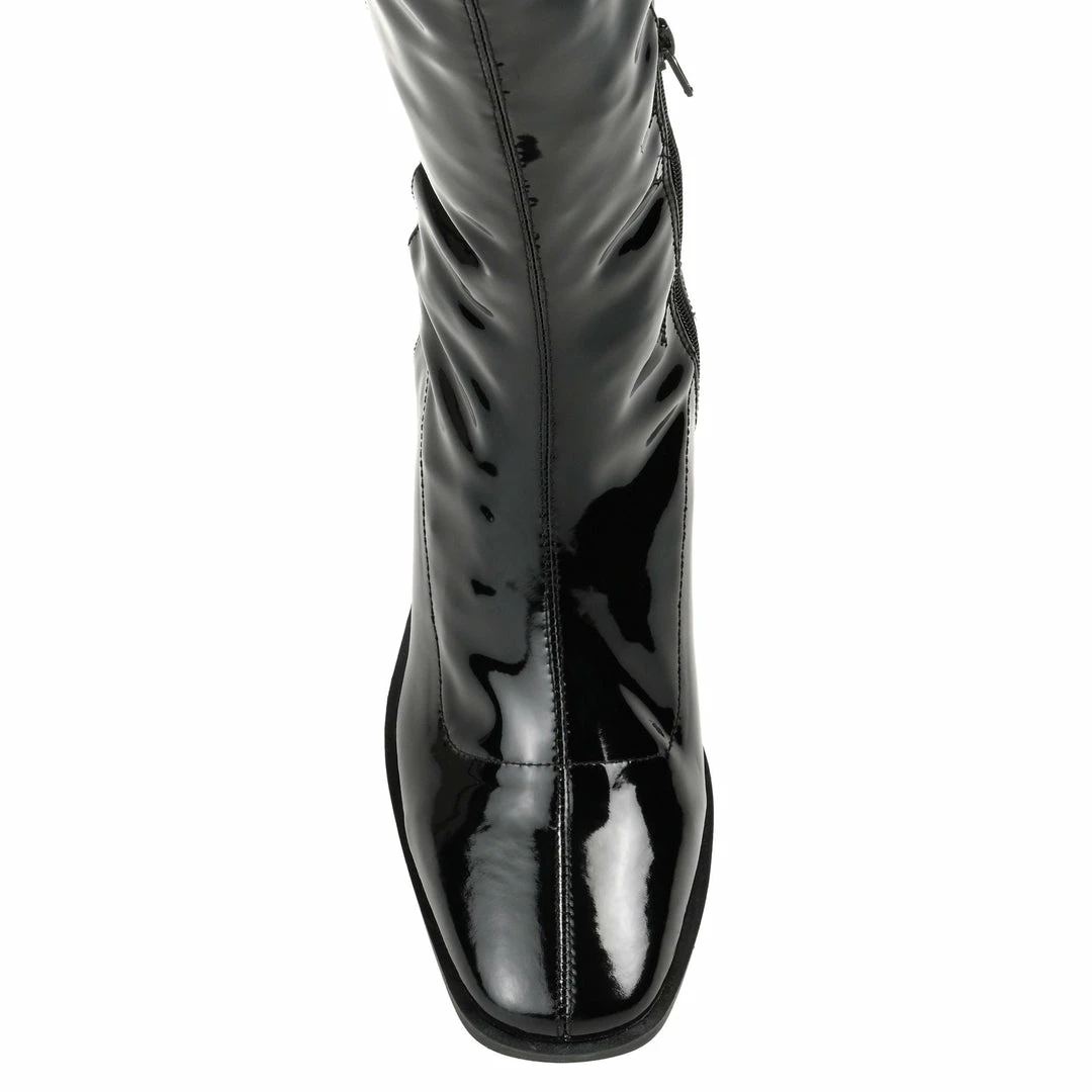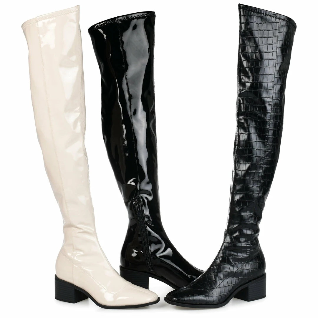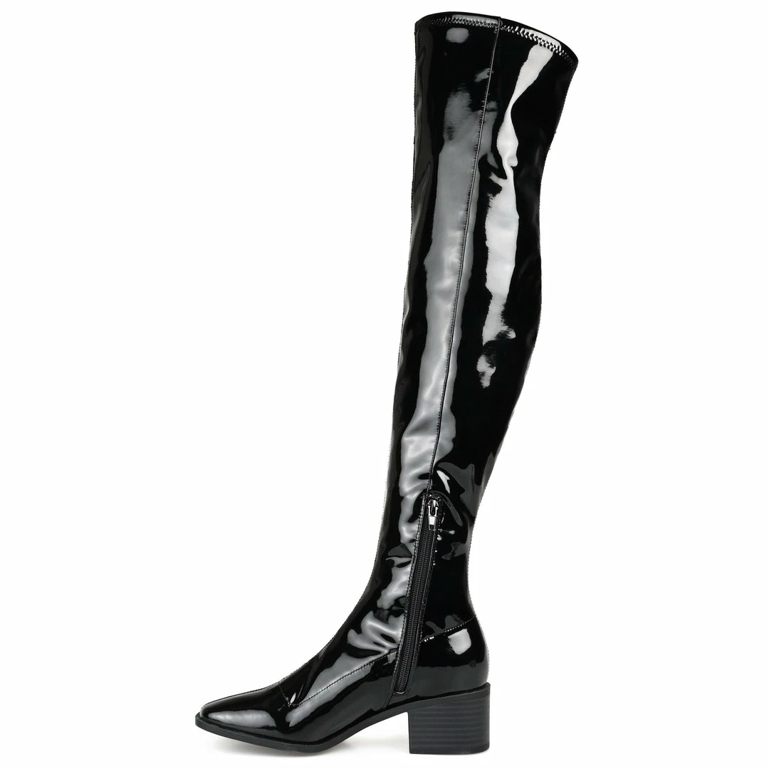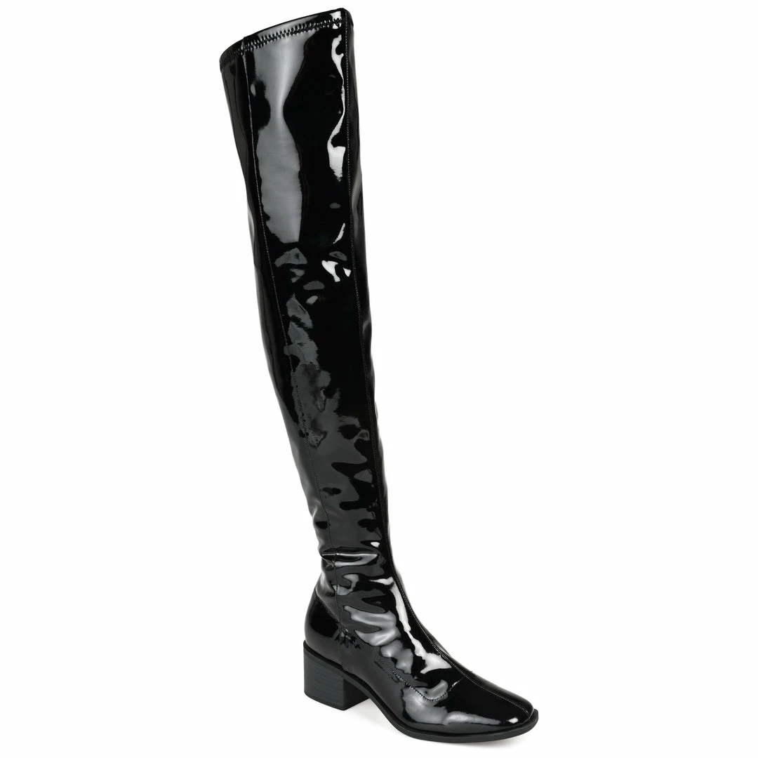 With a square-toe and stretchy vegan leather, this over-the-knee boot is the epitome of bold style.
