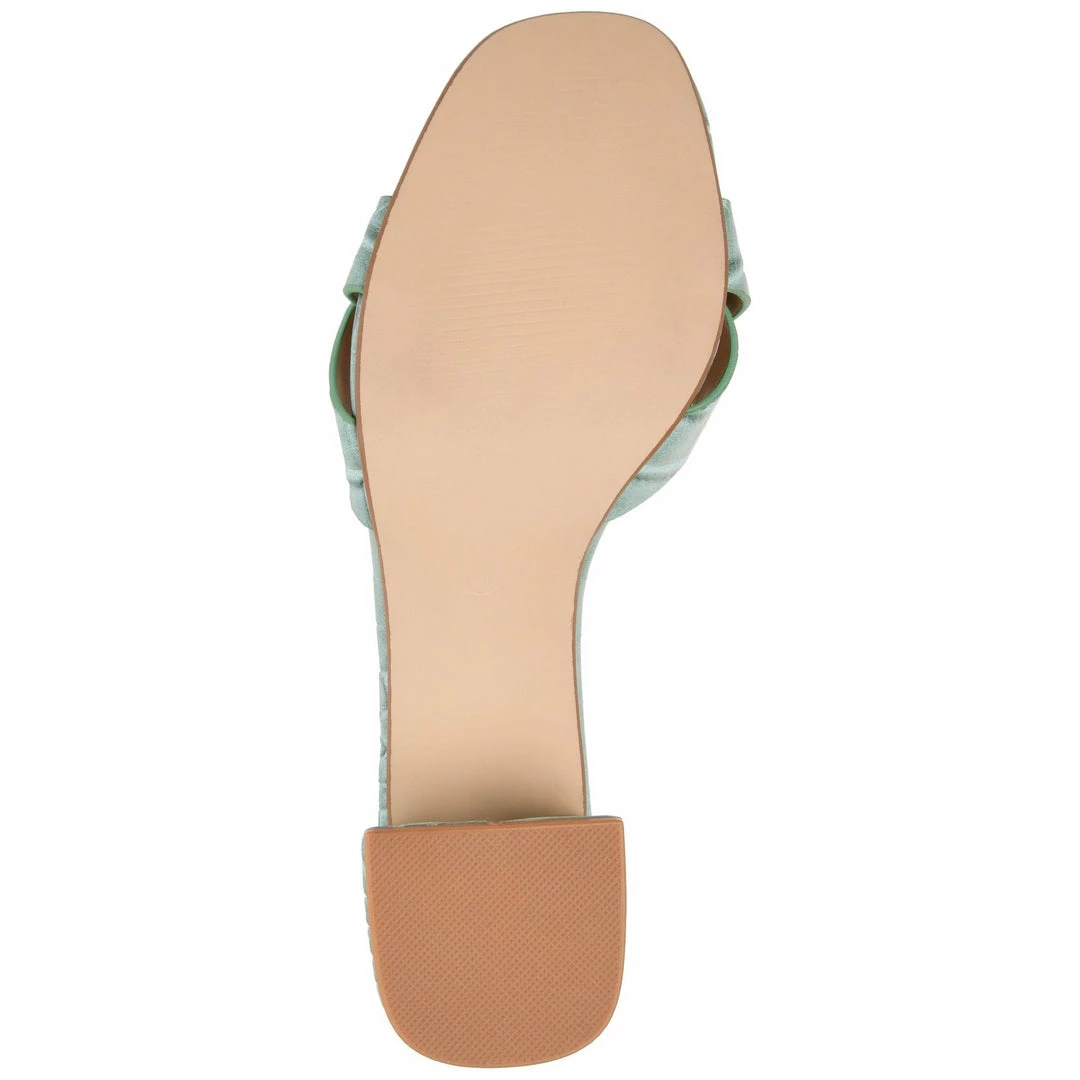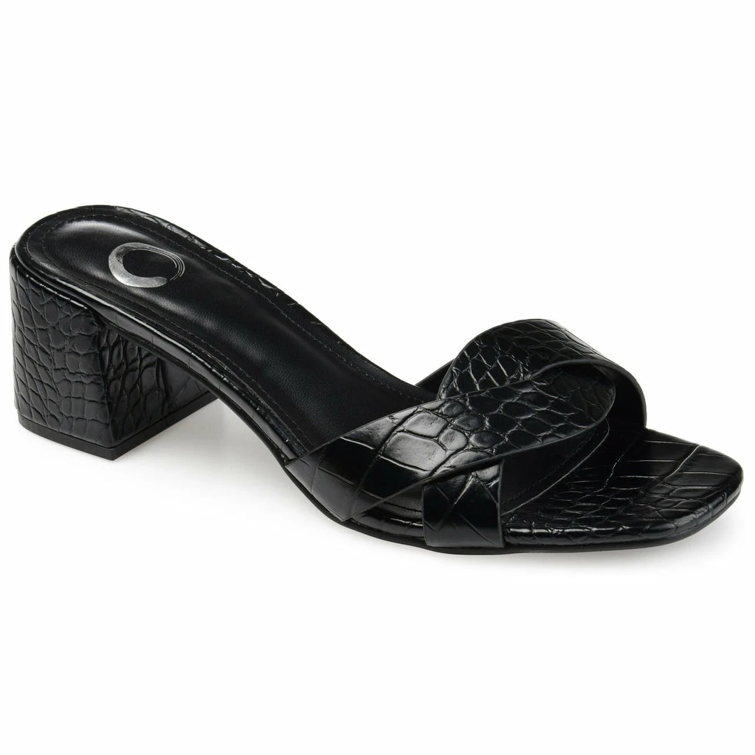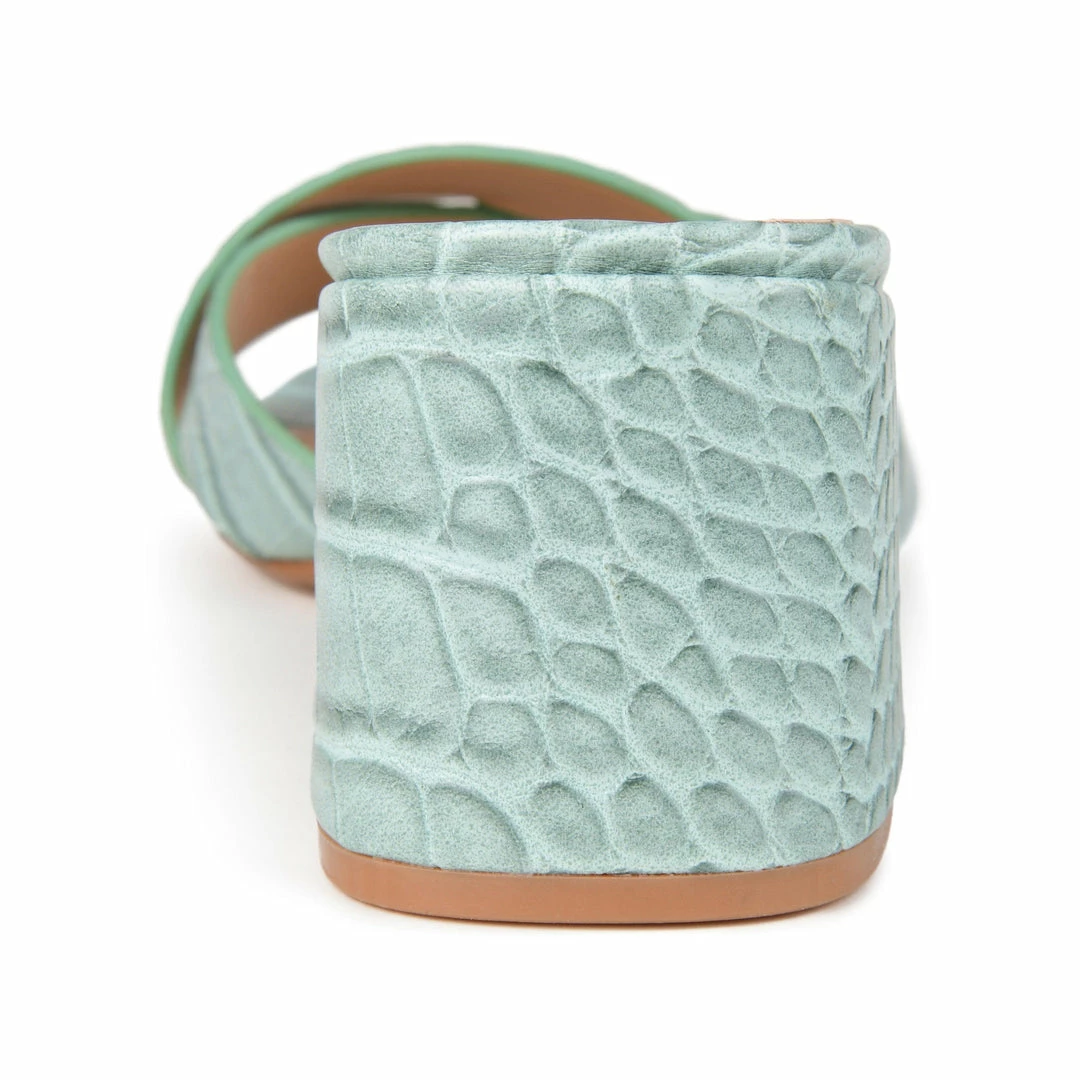 A crocodile texture covers this toe-strap sandal detailed with a vegan leather crisscross design and a covered low block heel.