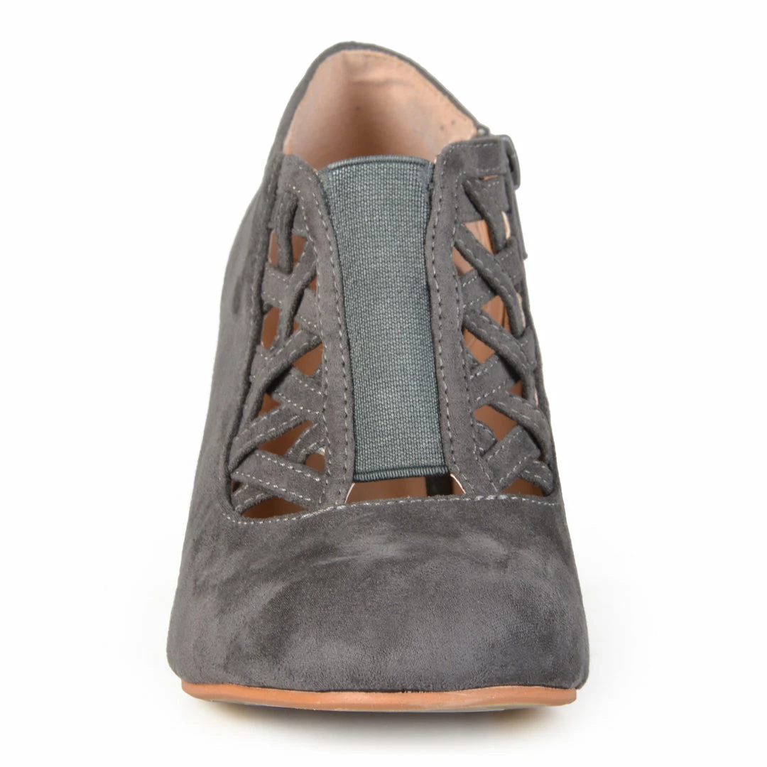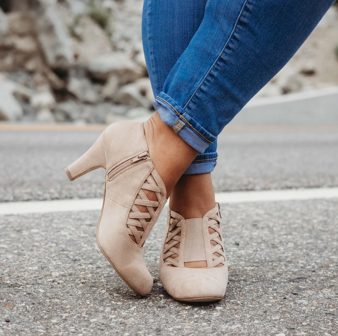 An open crisscross detail and stretch panel at the vamp embellish this vintage wide-width bootie. Buttery soft vegan suede, an inside zipper entry, and a block heel finish this darling heel.