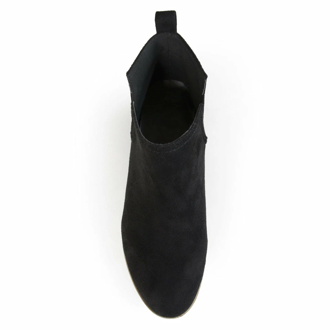 A distinctive split ankle and tab at the heel top this round-toe vegan suede bootie.