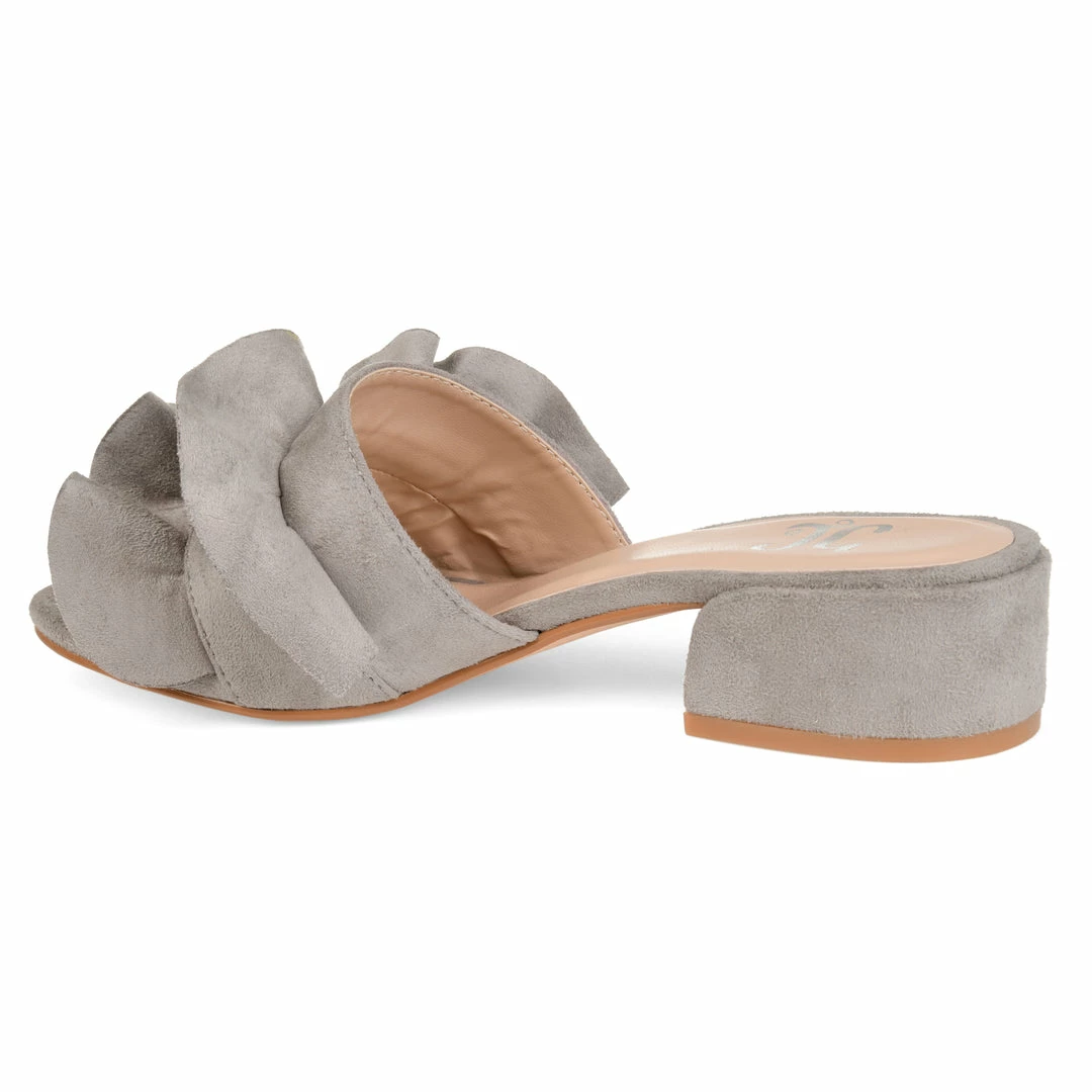 Flaunt your stems in these summer-time slip-on sandals topped with a velvety vegan suede ruffle.