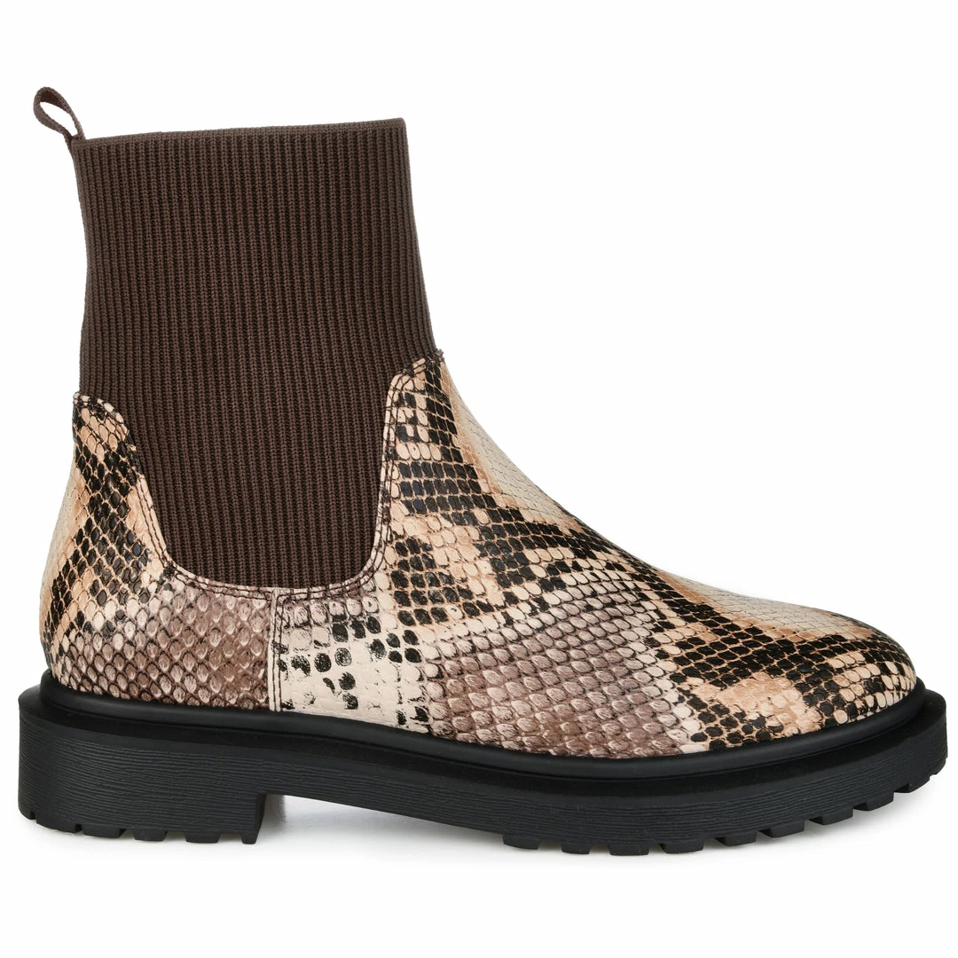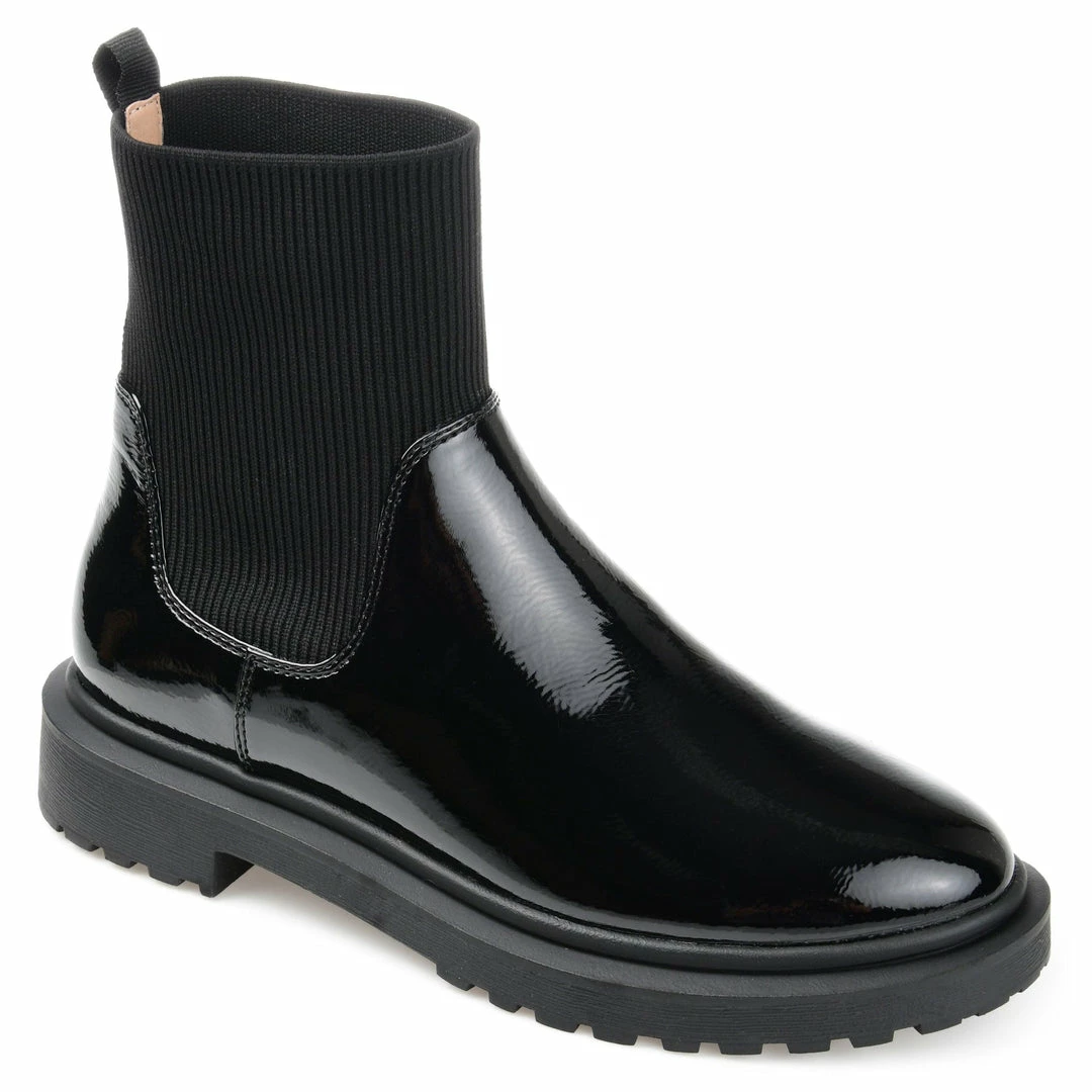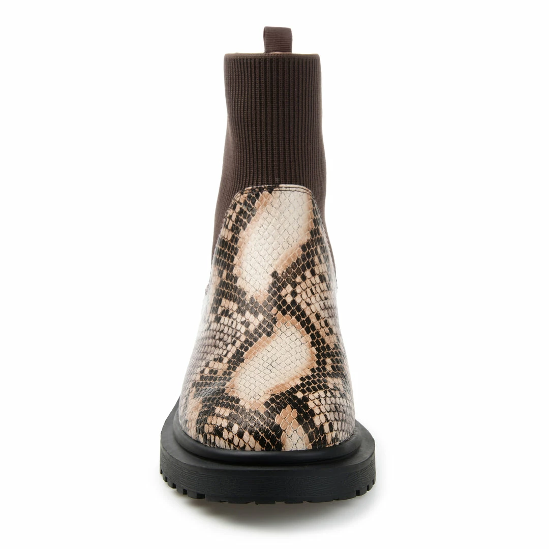 A chunky treaded platform sole and the coolest sock panel that wraps all the way around the ankle detail this round-toe bootie for a retro-cool look.