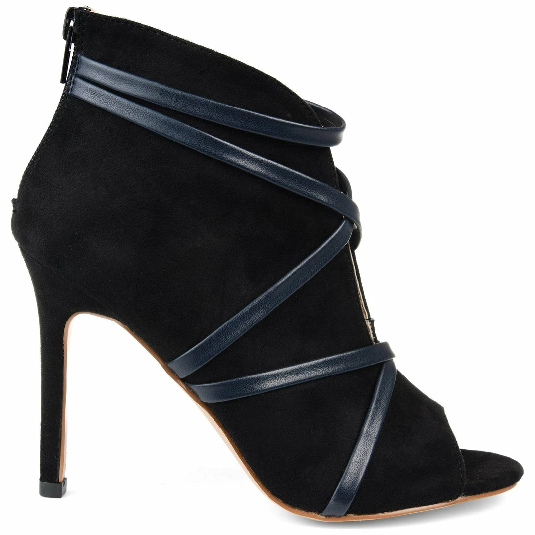 A crisscross strap wraps around this deeply notched peep-toe bootie mounted on a stiletto bootie for an alluring finish.