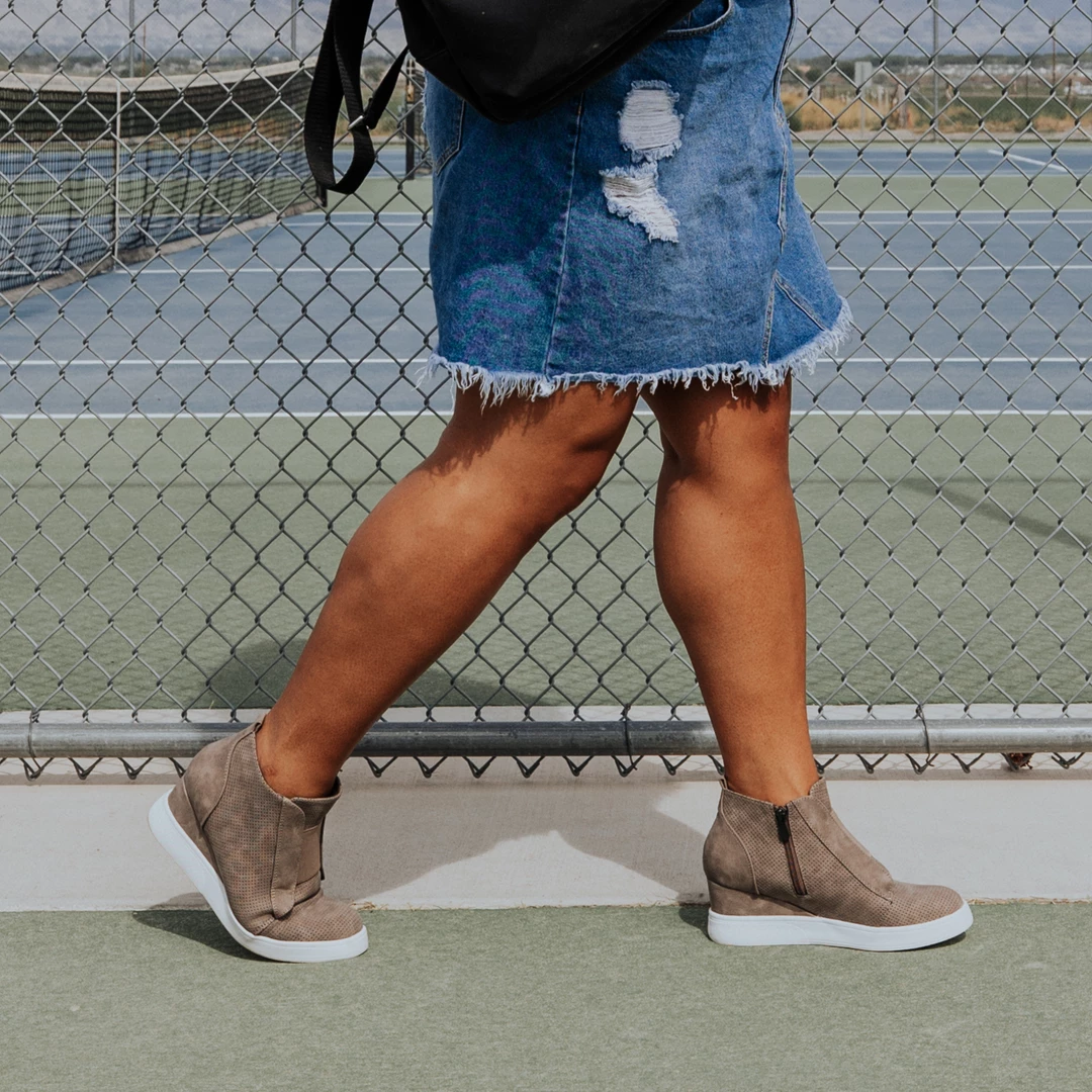 Kick-back in these cool wedge sneakers covered with pinhole details. A stretch detail at the vamp and a padded footbed finish this soft vegan leather design for a zero fuss look.