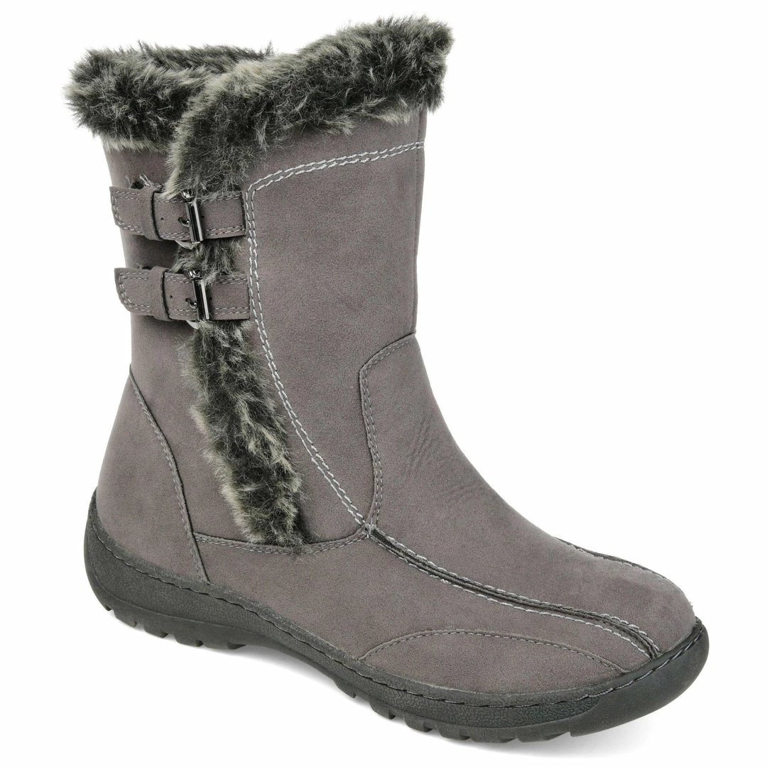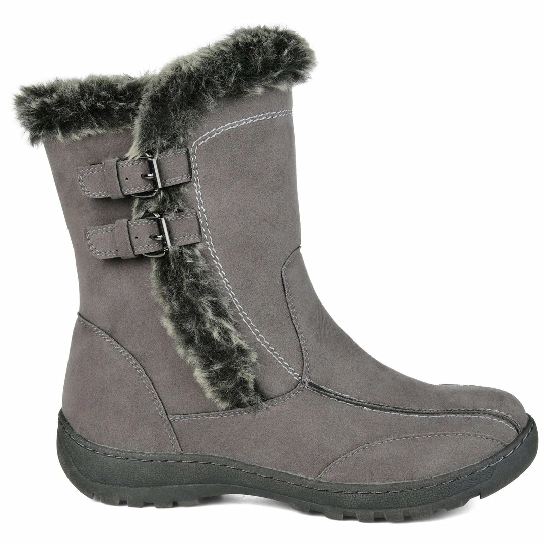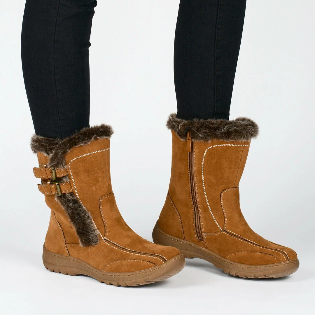 A cool, casual vegan suede pull-on boot featuring cozy synthetic fur trim, dual buckle details at the side, exposed stitching, and a light EVA sole.