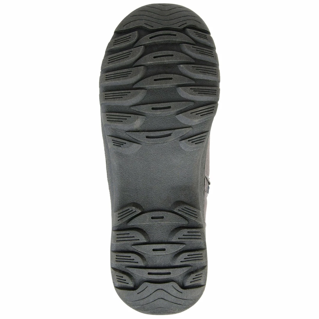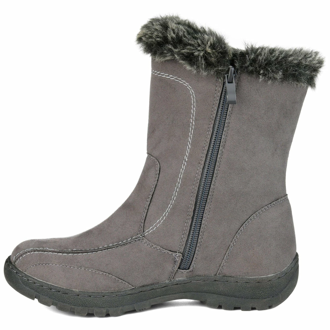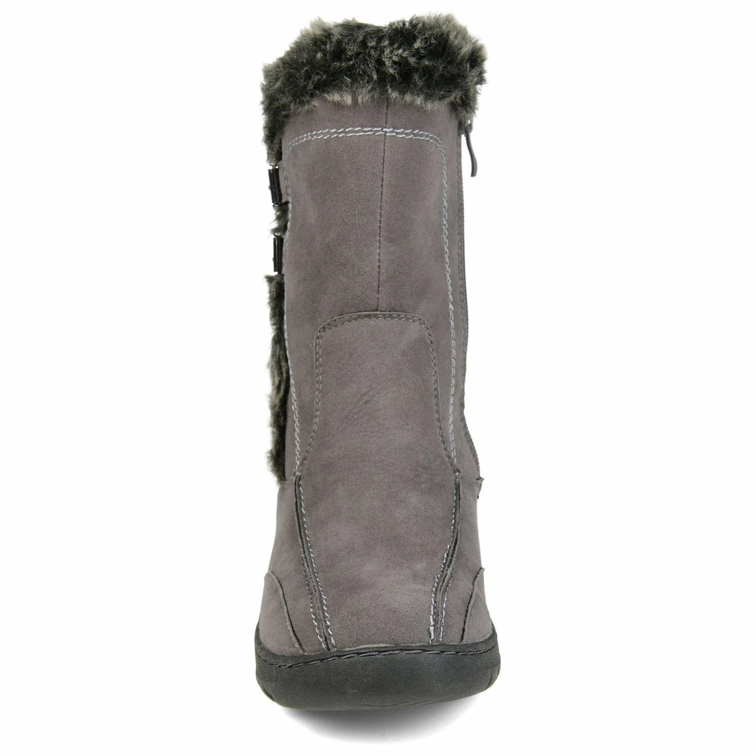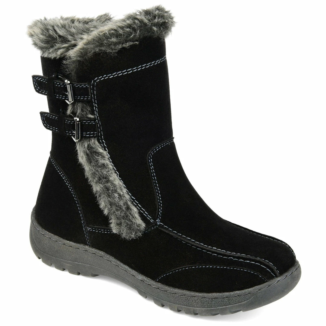 A cool, casual vegan suede pull-on boot featuring cozy synthetic fur trim, dual buckle details at the side, exposed stitching, and a light EVA sole.