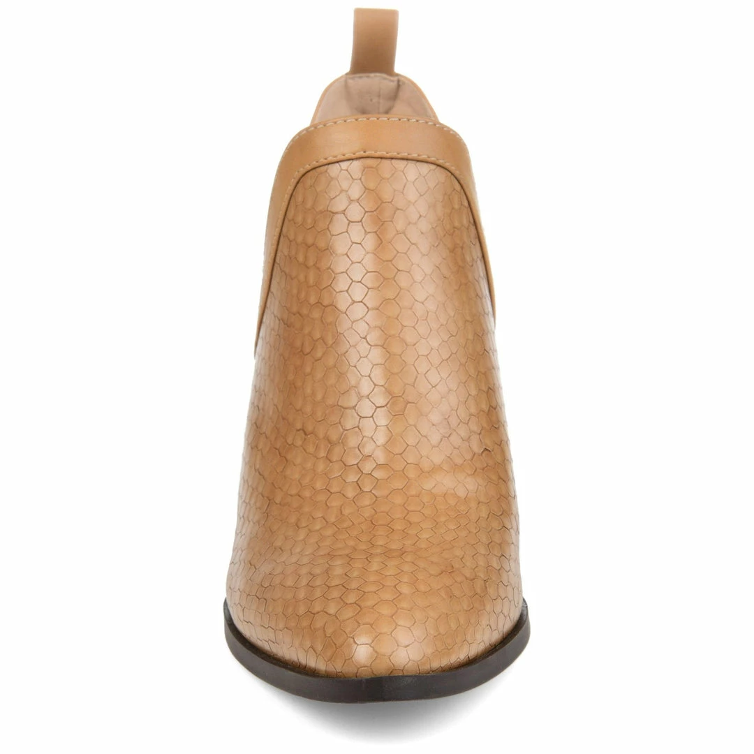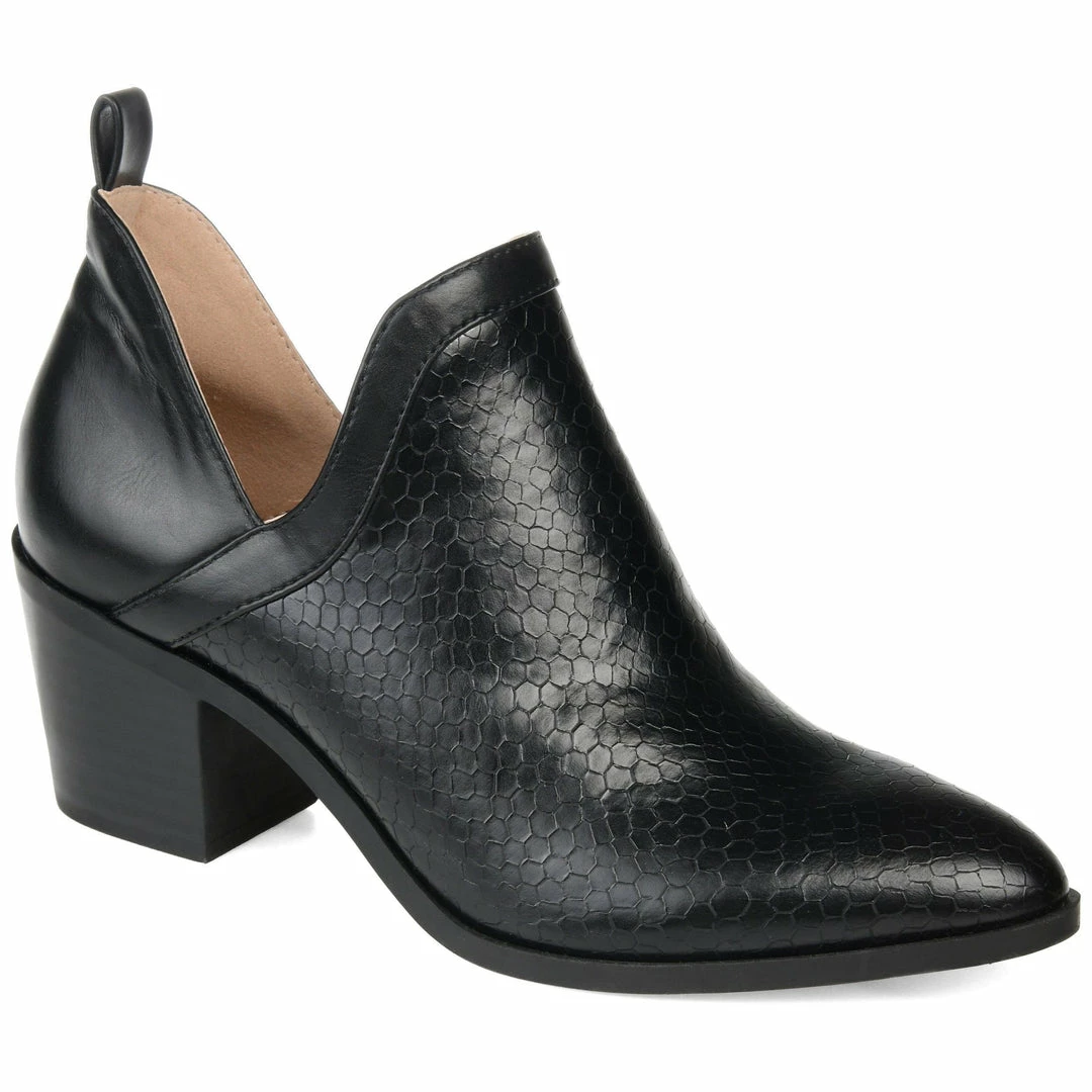 A block-heeled bootie that goes with everything, detailed with V-shaped cutouts at the sides, a tab at the heel, and textured vegan leather uppers.