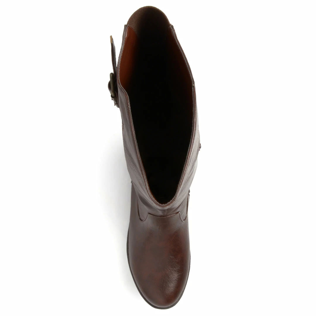 Buckle strap accents top this preppy wide-calf riding boot detailed with smooth vegan leather uppers and a high-low topline for a comfortable fit.