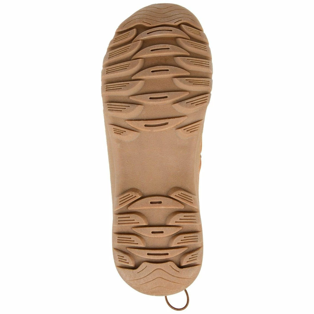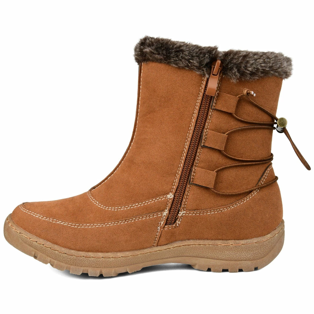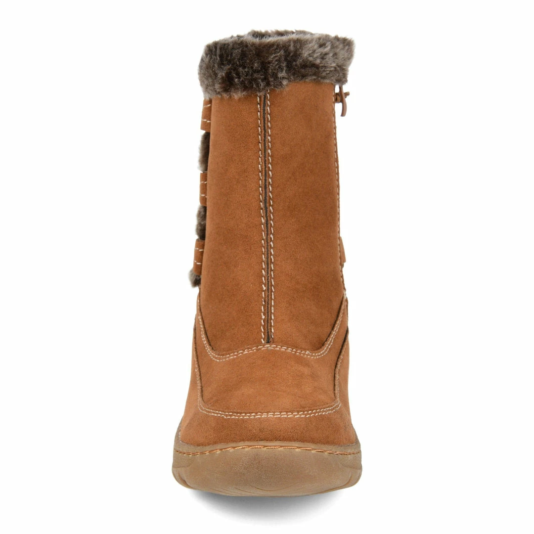 A lounge friendly vegan suede boot featuring soft synthetic fur trim, a toggled lace-up detail, and a treaded EVA sole.