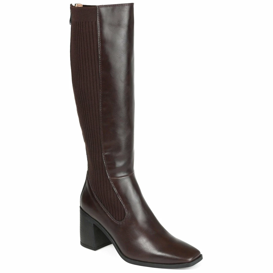 Up your fall wardrobe with this square-toe boot detailed with an extra-wide calf and a stretch knit panel.