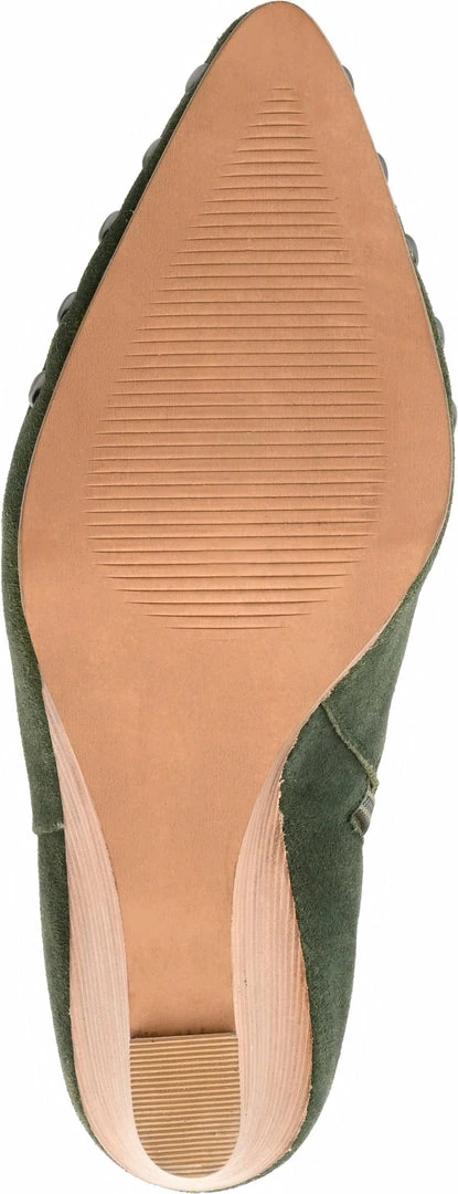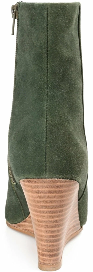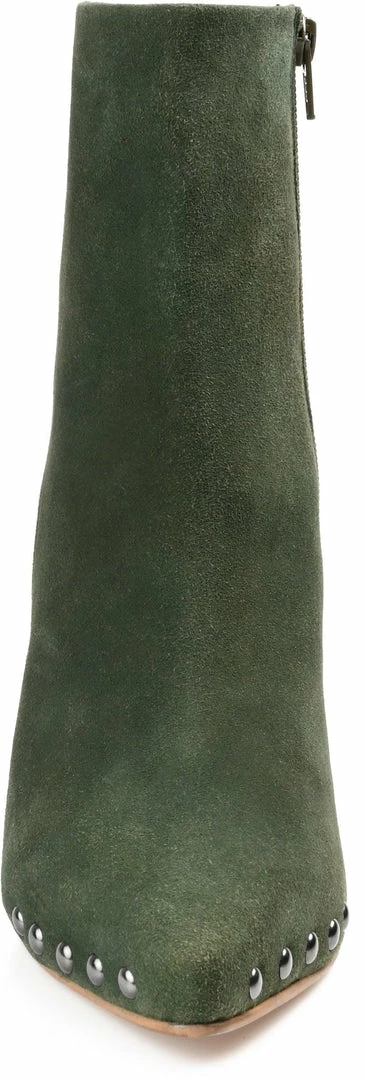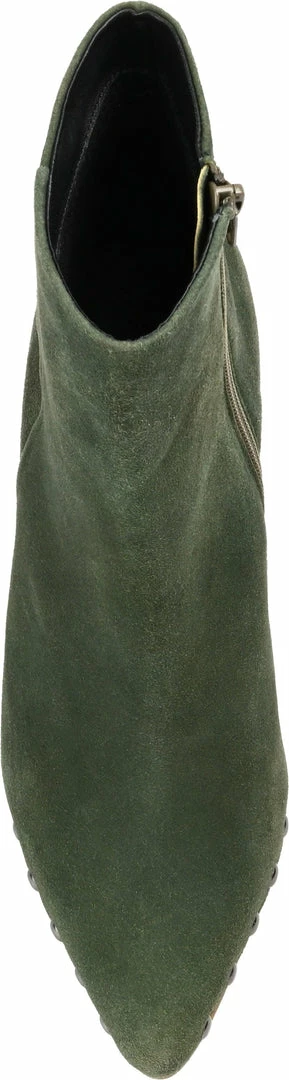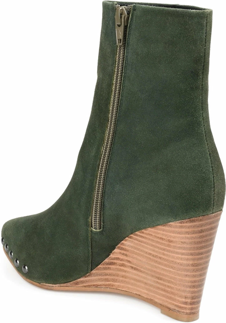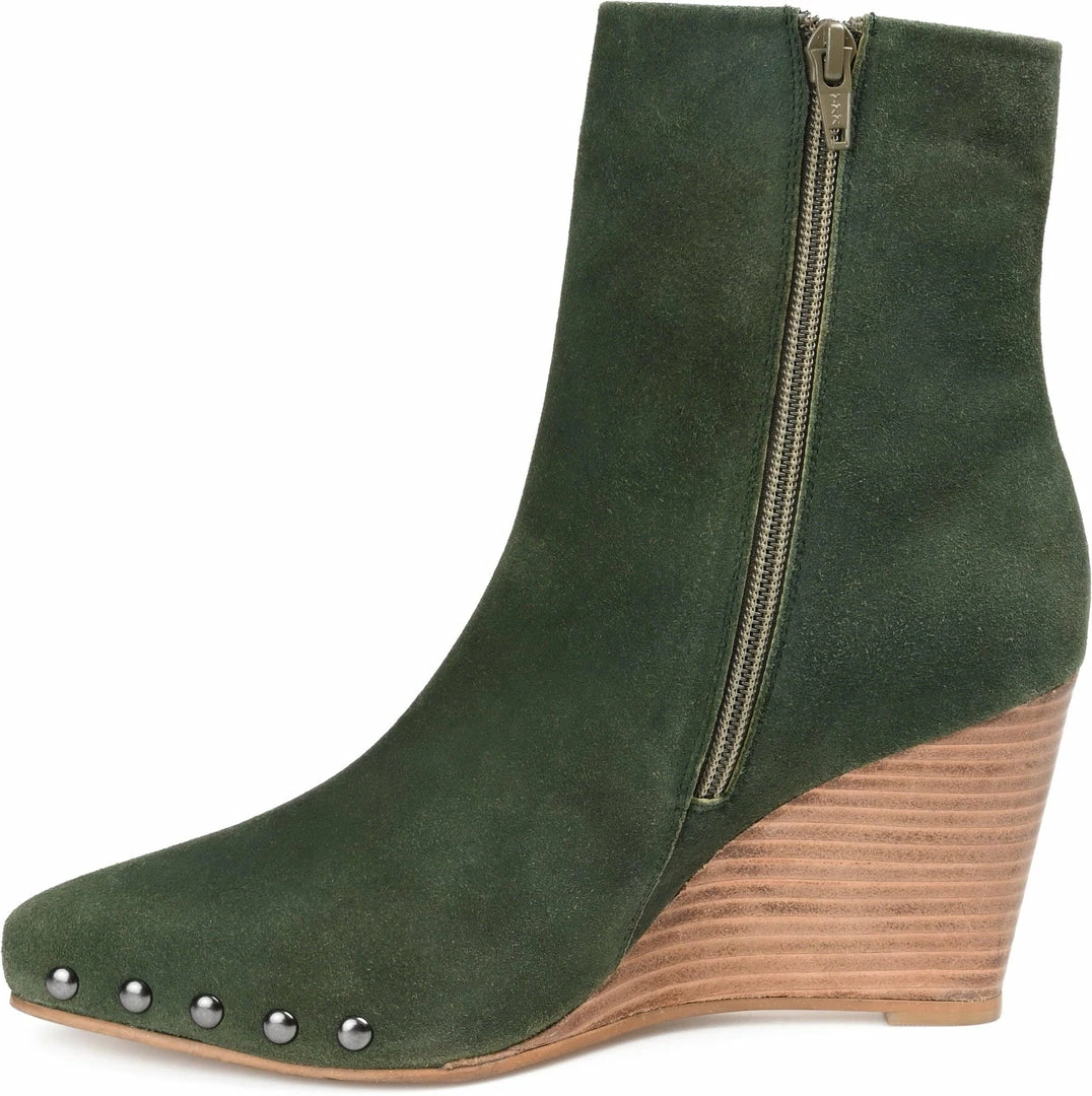 A wedge-heeled bootie boldly styled with an almond-toe and round studs.