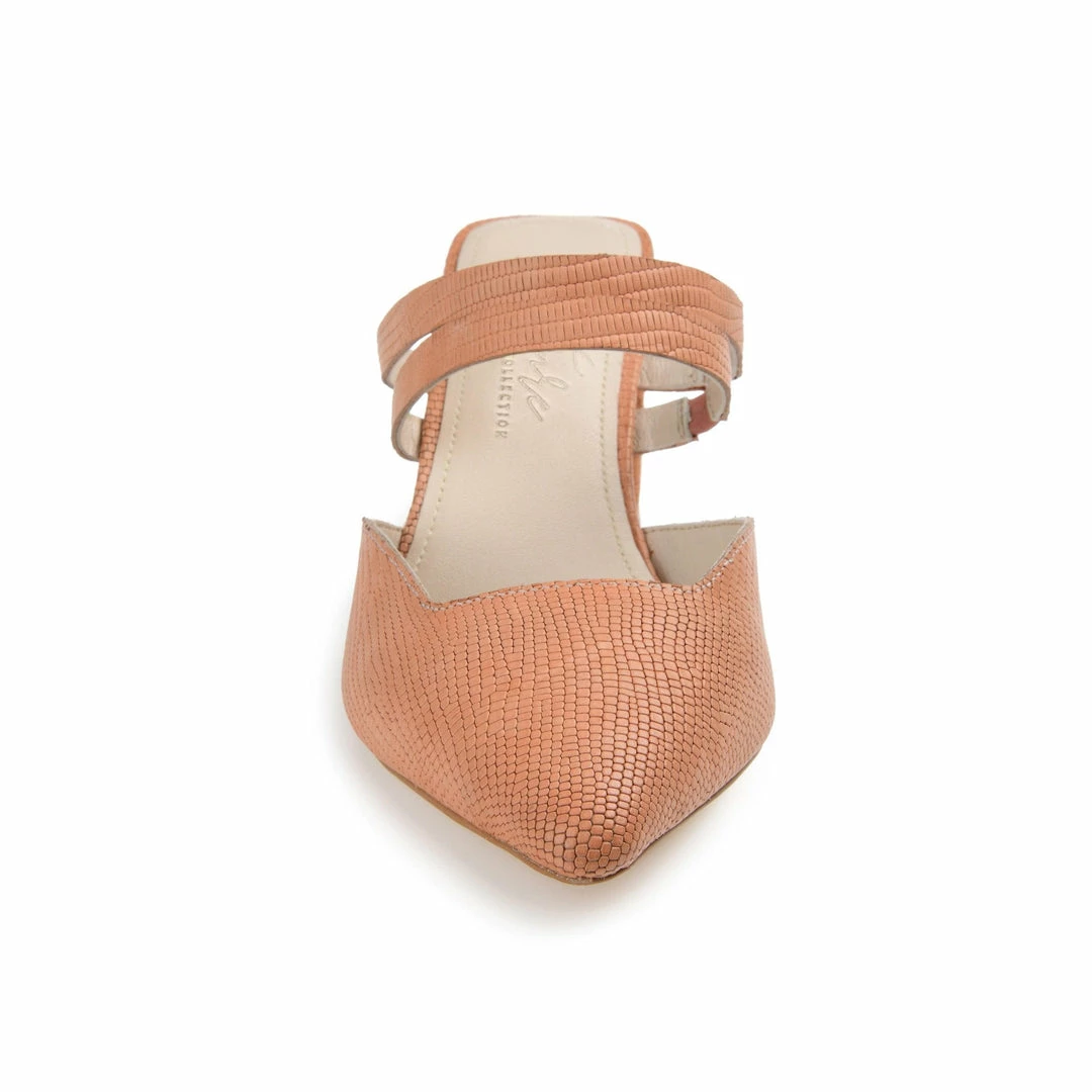 Twin straps rest atop this slip-on heel detailed with a boxed-shaped top line and stout block heel.